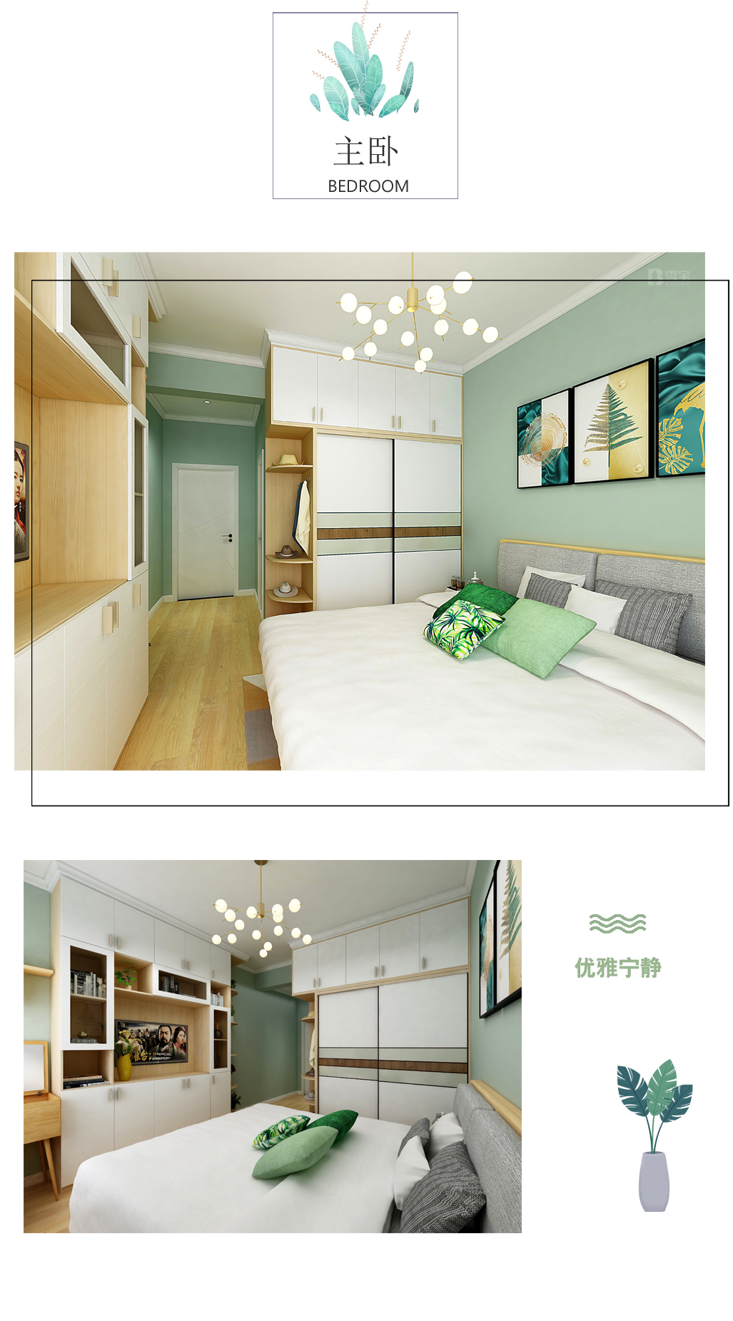 薄荷綠的點綴設計,能為臥室營造一個安靜的休息環(huán)境,仿佛能時刻感受到大自然的和煦微風和溫暖陽光,床頭對面白色柜子的設計,既擴大儲存空間,又增添一抹優(yōu)雅。