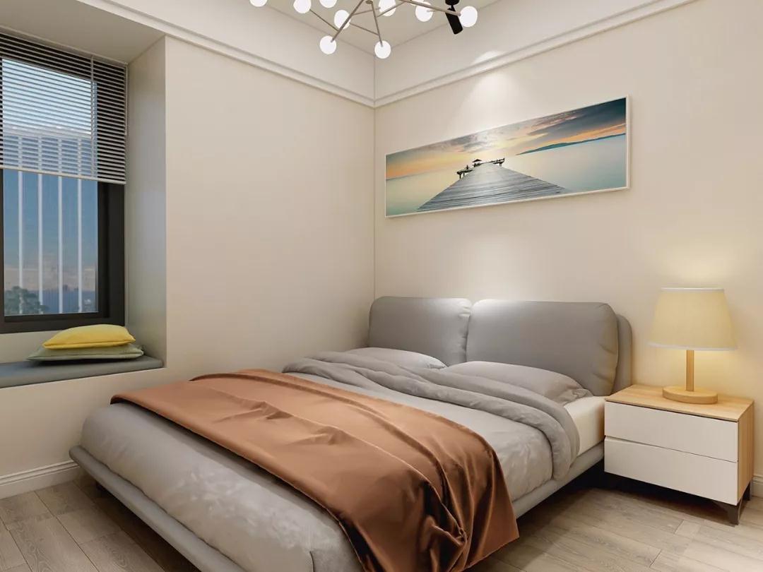除開(kāi)飄窗,次臥空間面積略顯擁擠局促。通過(guò)睡眠、學(xué)習(xí)、儲(chǔ)物、活動(dòng)四個(gè)基本功能區(qū)合理設(shè)計(jì)布局,既滿足日常儲(chǔ)物收納又不影響老人起居作息,在軟裝搭配上選擇深色系家紡,樸實(shí)沉穩(wěn),淡泊明志,寧?kù)o致遠(yuǎn)。