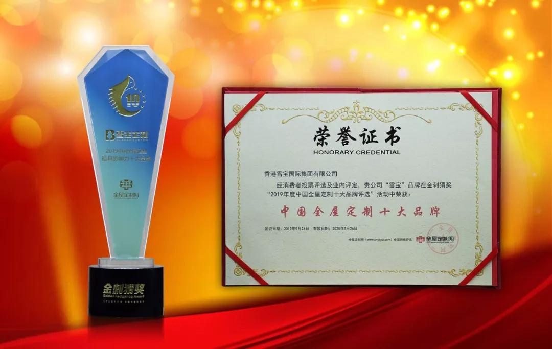 2019年11月5日,2019家居建材行業(yè)高峰論壇暨金刺猬獎(jiǎng)十大品牌頒獎(jiǎng)典禮在寧國伯爵王朝大酒店榮耀盛啟,本次盛典以“新形勢(shì)、新機(jī)遇、新未來”為主題。雪寶品牌憑借永葆創(chuàng)新的旺盛活力和優(yōu)質(zhì)的服務(wù)口碑最終評(píng)選出了具有權(quán)威性的“中國全屋定制十大品牌”榮譽(yù)。