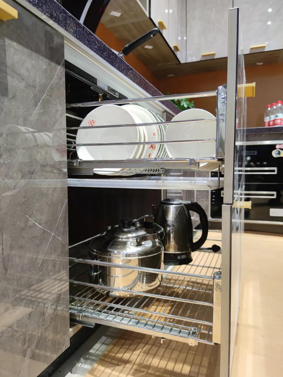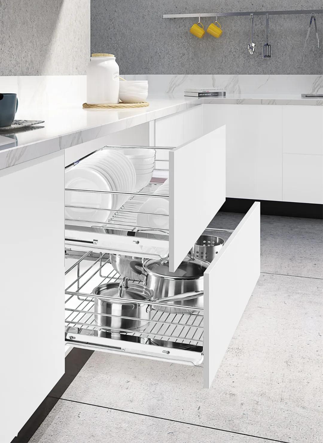 櫥柜拉籃:要說櫥柜的收納,不得不提到拉籃,F代的廚房櫥柜中,拉籃是必不可少的五金件之一。它提供了更多收納的可能,讓廚房更加整潔干凈。有了拉籃,廚房里大大小小的餐具再也不會堆成“慘劇”了。