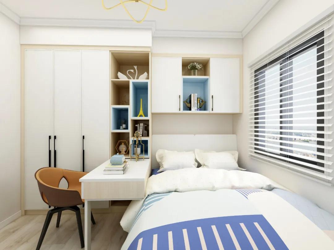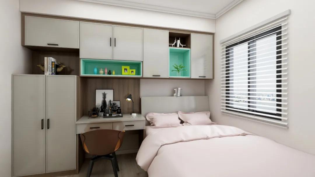 另外,書桌、柜體和床頭整體相連的設(shè)計(jì),能合理規(guī)劃布局。