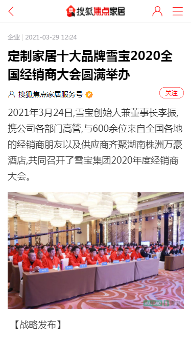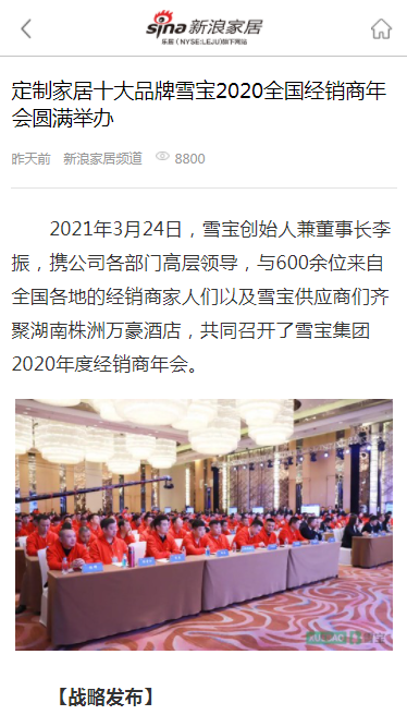今日頭條、百度、360、新浪家居、搜狐焦點(diǎn)、網(wǎng)易家居、騰訊家居、中國(guó)保護(hù)消費(fèi)者基金會(huì)、中國(guó)質(zhì)量新聞網(wǎng)、中國(guó)木材與木制品流通協(xié)會(huì)、中國(guó)質(zhì)量萬(wàn)里行、中國(guó)建材網(wǎng)、慧亞網(wǎng)、一兜糖、小紅書(shū)、慧聰網(wǎng)、中華衣柜網(wǎng)、央廣網(wǎng)、太平洋家居網(wǎng)、品牌網(wǎng)、齊家、全屋定制網(wǎng)、中國(guó)木業(yè)網(wǎng)、紅網(wǎng)等等上百家行業(yè)主流、權(quán)威媒體爭(zhēng)相關(guān)注,開(kāi)啟專(zhuān)題報(bào)道,將雪寶2020年度經(jīng)銷(xiāo)商年會(huì)盛典線(xiàn)上曝光度推向高潮。