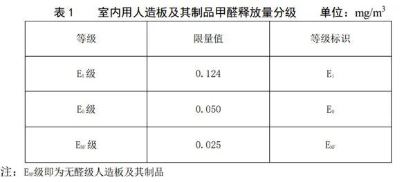 ★ 該標(biāo)準(zhǔn)將室內(nèi)用人造板及其制品的甲醛釋放量按照限量值分為3個等級,即E1級(≤0.124mg/m³)、E0級(≤0.050mg/m³)和ENF級(≤0.025mg/m³)。