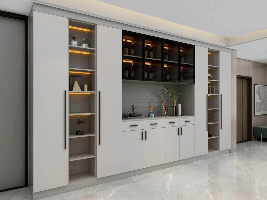 隨著現(xiàn)代生活理念的變化,輕奢元素進入更多年輕一代的生活,能更好的襯托出餐廳的格調(diào)。定制餐邊柜將墻面最大程度地利用,一柜到頂,合理劃分區(qū)域,做到餐具收納+展示柜+酒柜的多功能結(jié)合,是最佳的呈現(xiàn)。
