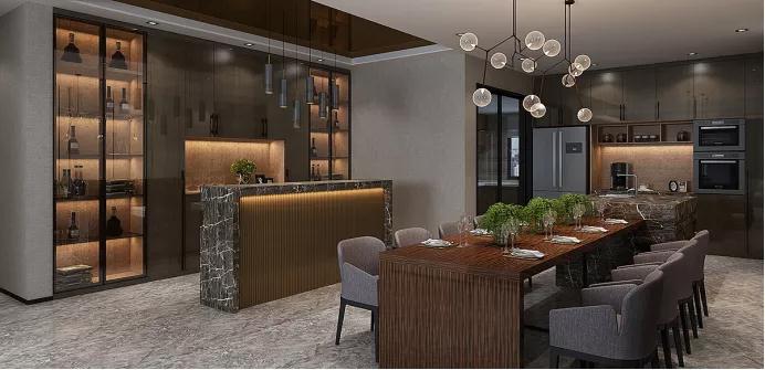金屬酒柜充滿了輕奢氣韻,酒柜陳列錯(cuò)落有致,精致在一瞬間充分體現(xiàn)。木材、金屬、玻璃的碰撞,別具一格!餐邊柜采用通透的黑色窄框玻璃門搭配,虛實(shí)結(jié)合,提升餐廳氣質(zhì)。