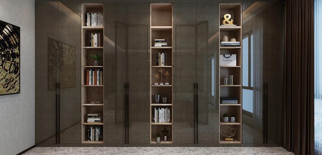 臥室衣柜在設(shè)計(jì)中同樣運(yùn)用了黑框玻璃門與高光門的結(jié)合,直線條的設(shè)計(jì)貫穿于整個(gè)空間,營造出一個(gè)時(shí)尚雅致且靈動的空間氛圍。