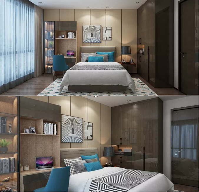 次臥設(shè)計(jì)增加了書柜書桌組合,滿足工作學(xué)習(xí)及休息的私人時(shí)光。
