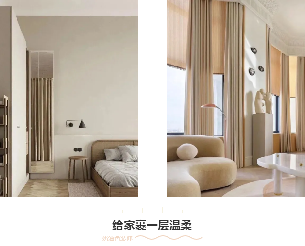 奶油色質感細膩,飽和度低但明亮度較高,奶油風給家居空間帶來簡約大氣又不失溫柔的質感,家中裝修多用奶油色能讓人的精神一秒放松下來。