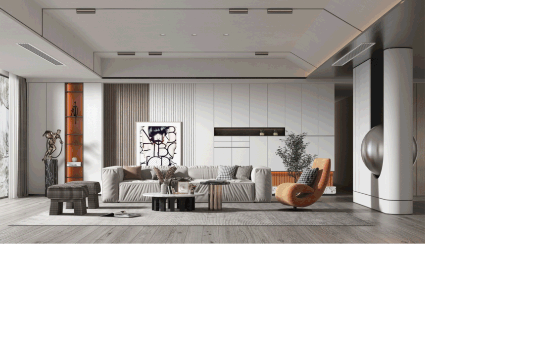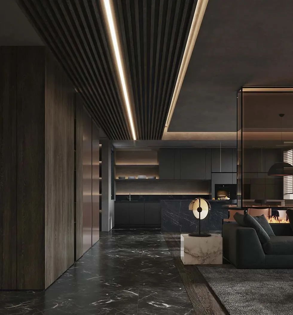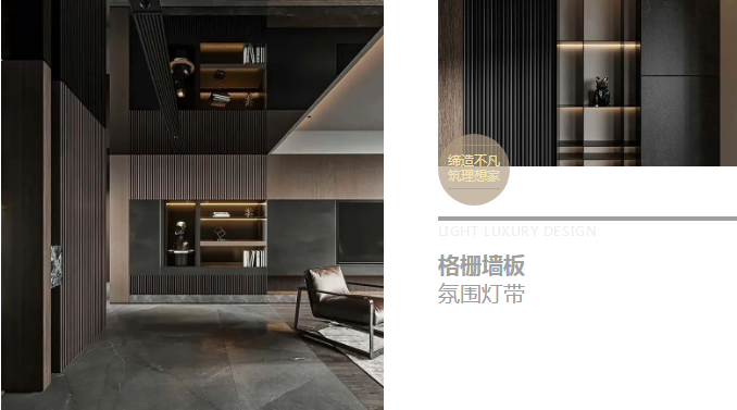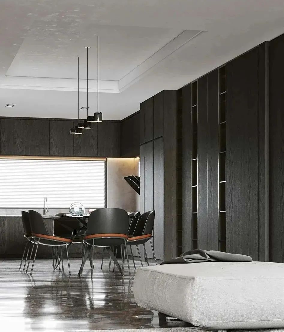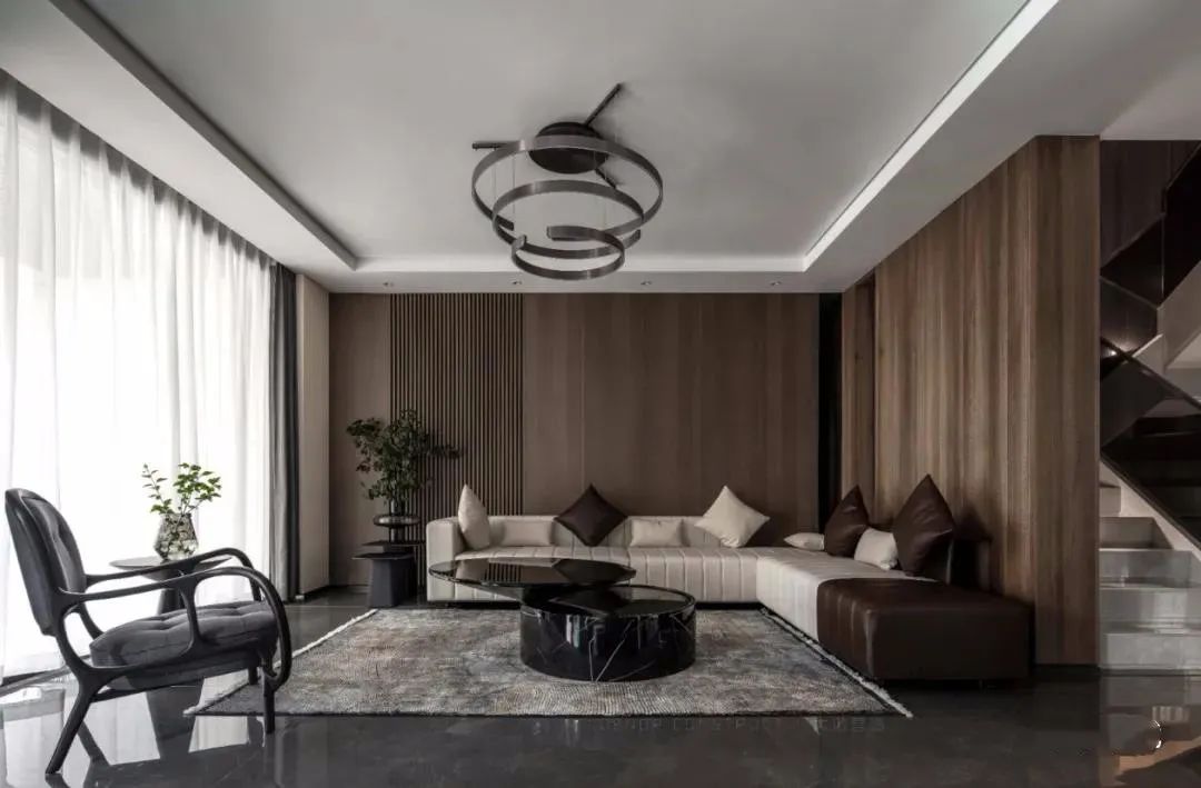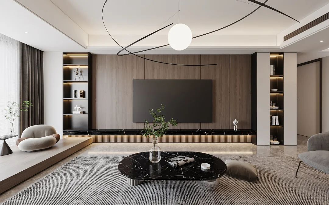在開放式的空間布局,將空間中的飾面墻、電視柜、展示柜、收納柜等進行有機串聯(lián),鋪設(shè)出連貫輕簡而自如的功能氛圍,不同的飾面表現(xiàn)模式穿插其間,塑造出維度豐富、視覺飽滿的一體化系統(tǒng),更將優(yōu)雅與沉穩(wěn)彌散進空間的每個角落。