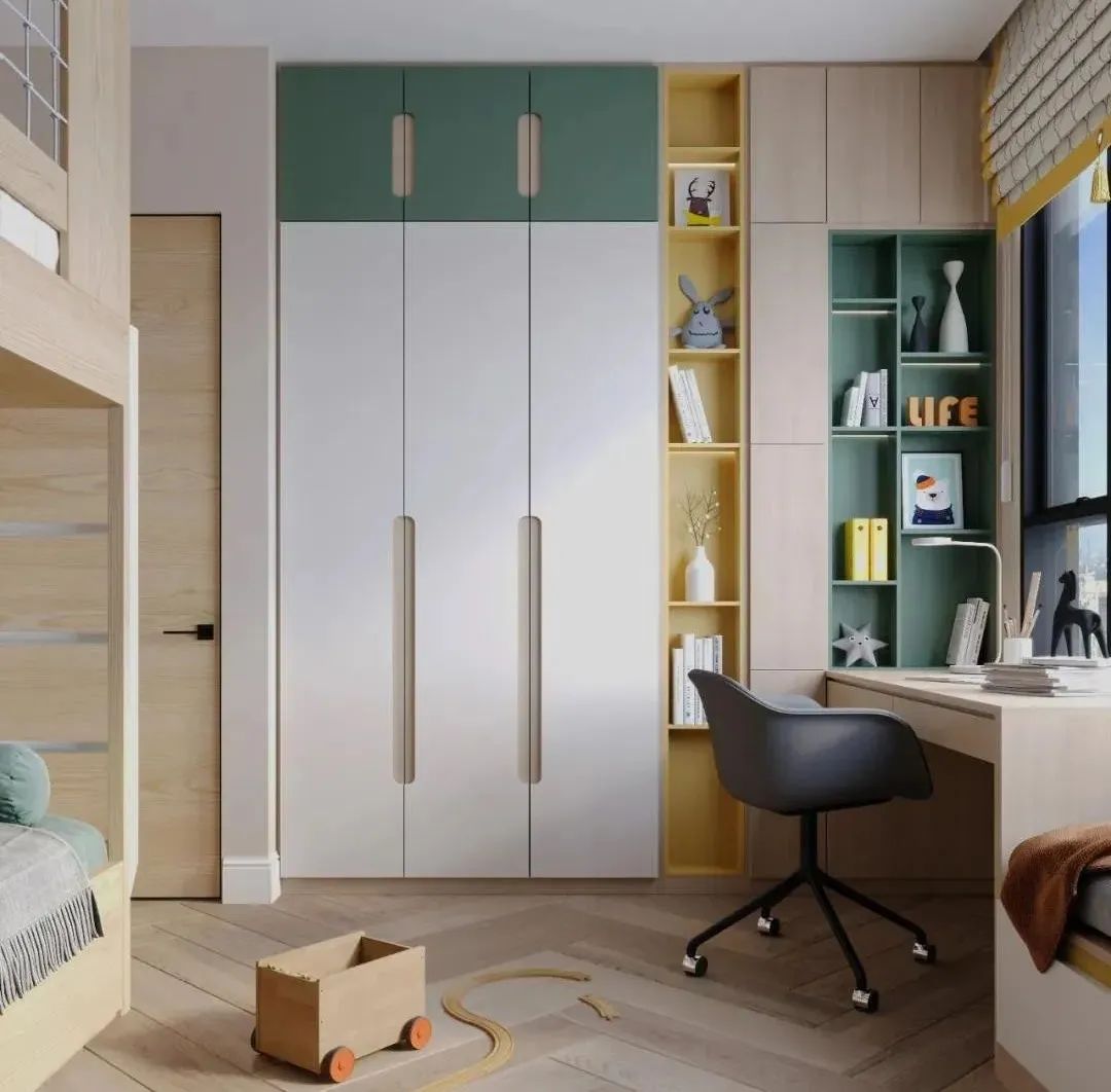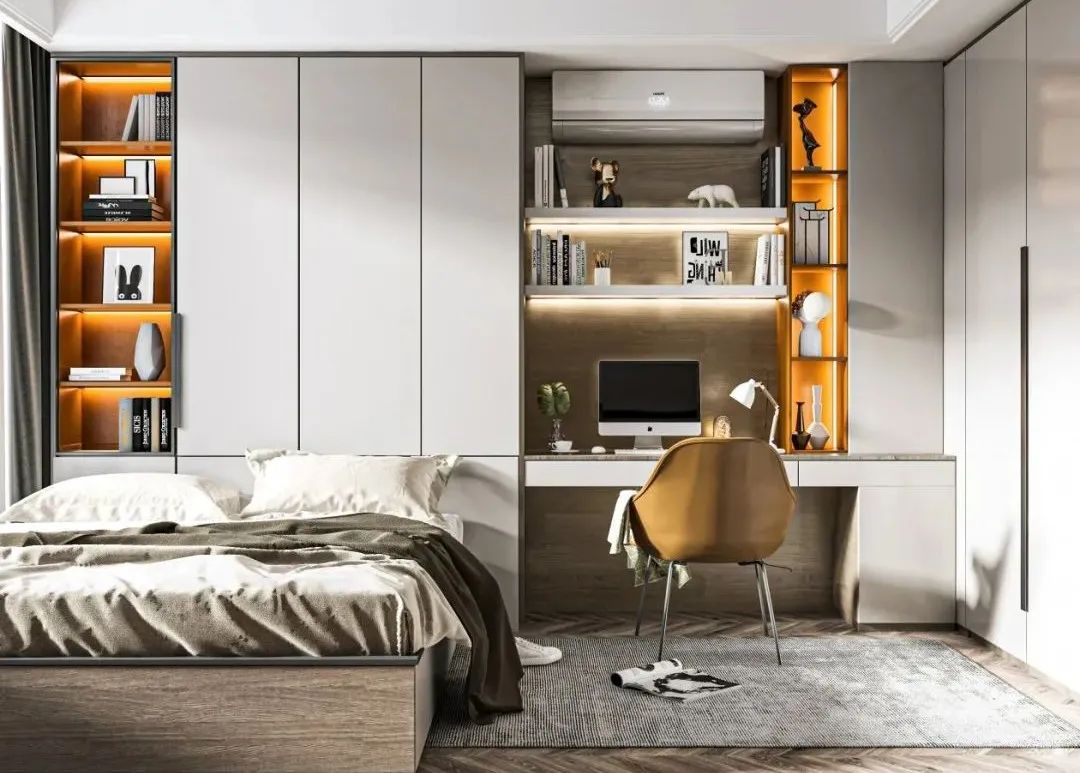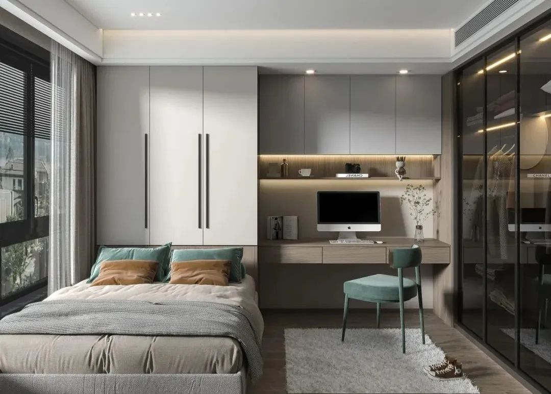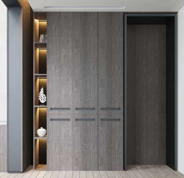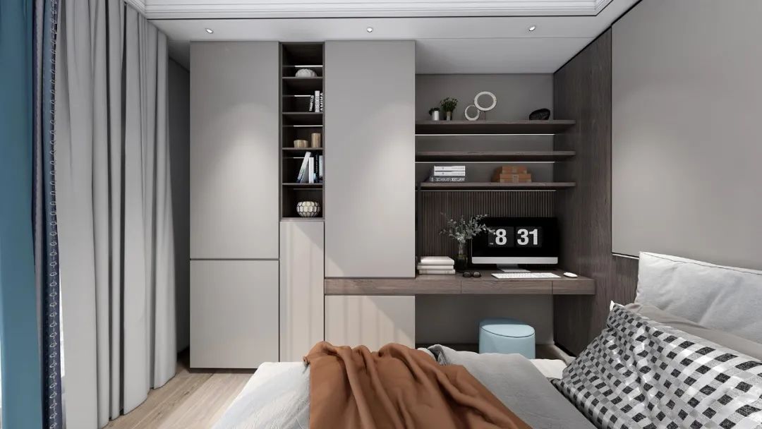 當(dāng)然,現(xiàn)在還有一種比較尷尬的戶型,那就是臥室門跟電視背景墻在同一側(cè)的情況。這時(shí)候可以利用柜門與柜體同色系的做法,打造出一款隱形門,既不會(huì)影響視覺觀感,還能夠減去敲砌墻的麻煩。
