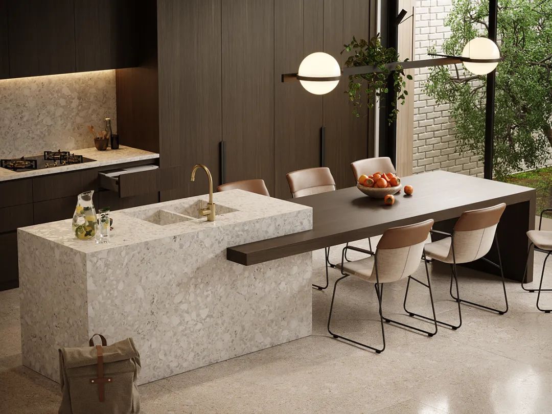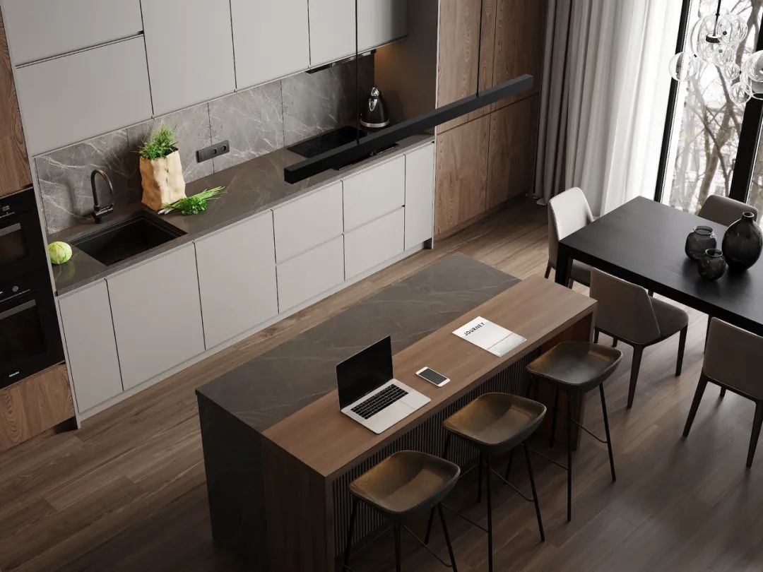 靠廚房設(shè)計(jì)為大理石或巖板,另外一邊設(shè)計(jì)為餐桌,這種設(shè)計(jì)動(dòng)線也十分流暢。大理石或巖板可以放洗好的菜和碗碟,另一邊可直接吃飯,這種空間少了隔墻隔斷,也會顯得更加開闊明亮。