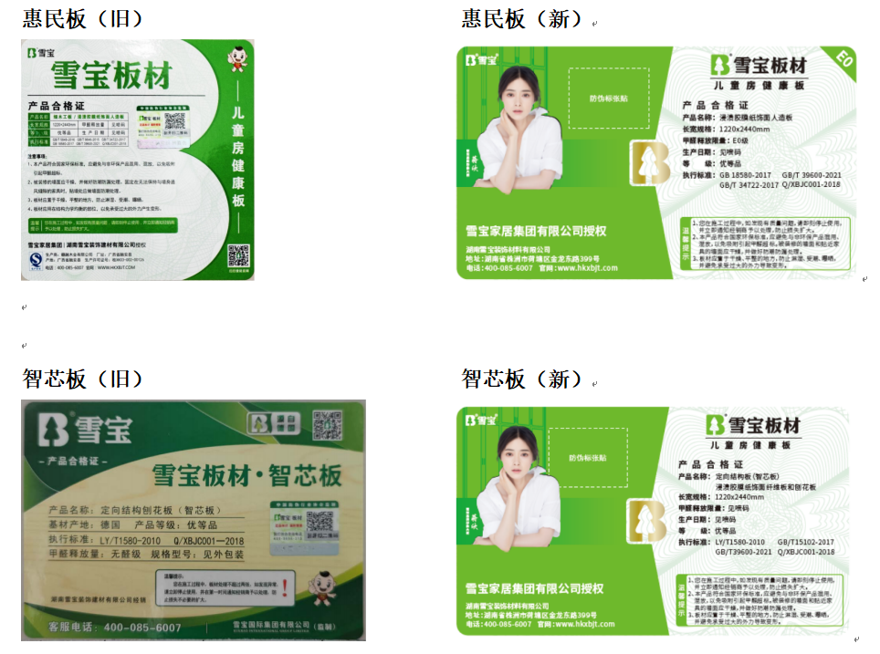 因合格證種類較多,在此不一一列舉。在新舊款合格證更替期間,將存在一部分新舊合格證共存的貨品,請客戶朋友們認準雪寶板材防偽商標和板材表面熒光水印。無論板材表面粘貼新款或舊款合格證,只要防偽驗證后為真,同時板材表面有熒光水印即為雪寶板材正品。