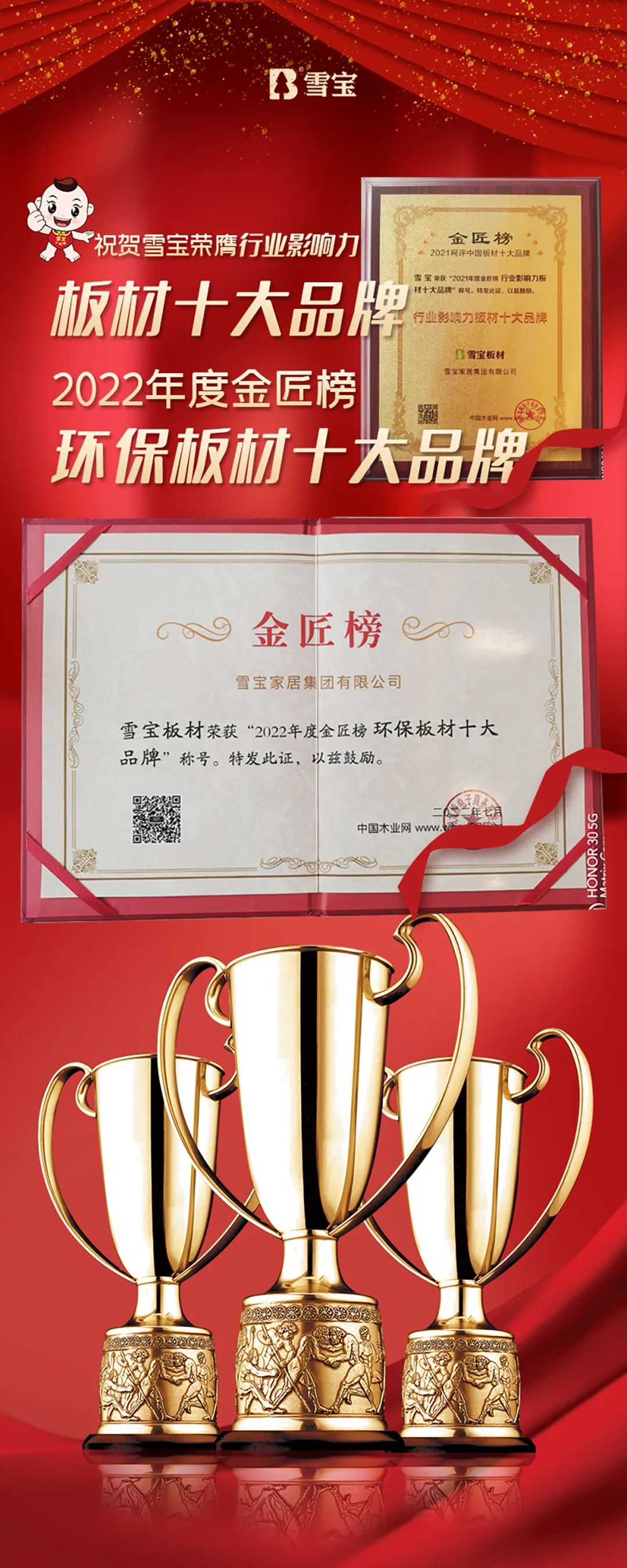 匠心匠材,好板好柜。雪寶憑借著優(yōu)異的產(chǎn)品品質(zhì)和消費(fèi)者的高度好評(píng)以及家喻戶曉的品牌知名度,在眾多板材品牌中脫穎而出,獲得認(rèn)可,榮獲中國(guó)板材行業(yè)影響力“板材十大品牌”、“中國(guó)環(huán)保板材十大品牌”雙項(xiàng)大獎(jiǎng)。