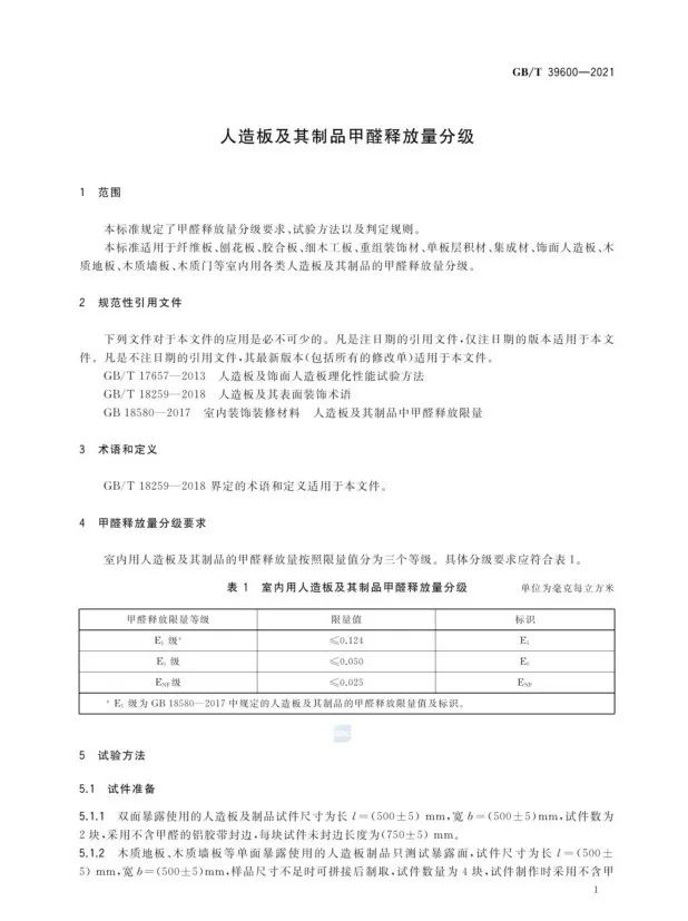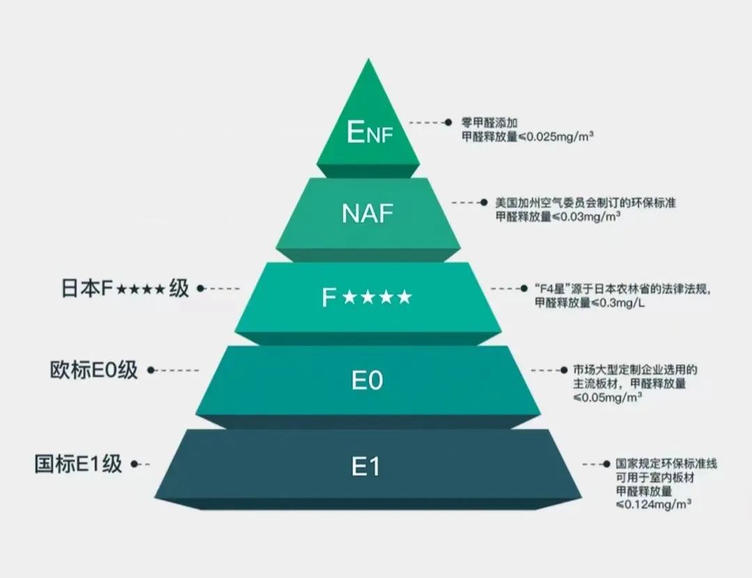該標(biāo)準(zhǔn)將室內(nèi)用人造板及其制品的甲醛釋放量按照限量值分為3個(gè)等級,即E1級(≤0.124mg/m³)、E0級(≤0.050mg/m³)和ENF級(≤0.025mg/m³)。新國標(biāo)ENF級成為了全球人造板行業(yè)最嚴(yán)苛的環(huán)保等級標(biāo)準(zhǔn),規(guī)定甲醛釋放量數(shù)值超過歐美、日本環(huán)保標(biāo)準(zhǔn)。