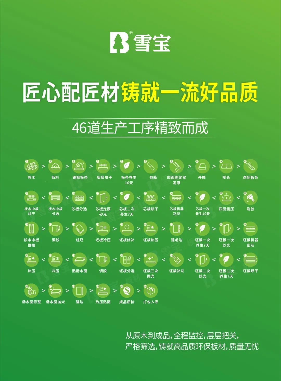 于雪寶板材兒童房健康板而言,堅(jiān)持“以初心致匠心”,以工匠精神近30載深耕環(huán)保板材領(lǐng)域,始終堅(jiān)守產(chǎn)品品質(zhì),46道生產(chǎn)工序?yàn)槠焚|(zhì)精雕細(xì)琢,確保每一個(gè)細(xì)節(jié)都極致呈現(xiàn),從原木到成品全程監(jiān)控,層層把關(guān)嚴(yán)格篩選,鑄就高品質(zhì)環(huán)保板材,真正實(shí)現(xiàn)品質(zhì)無憂,即裝即住,自在舒心。