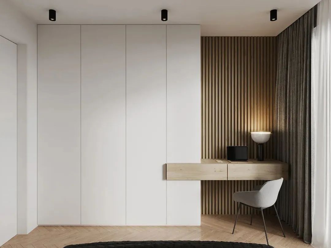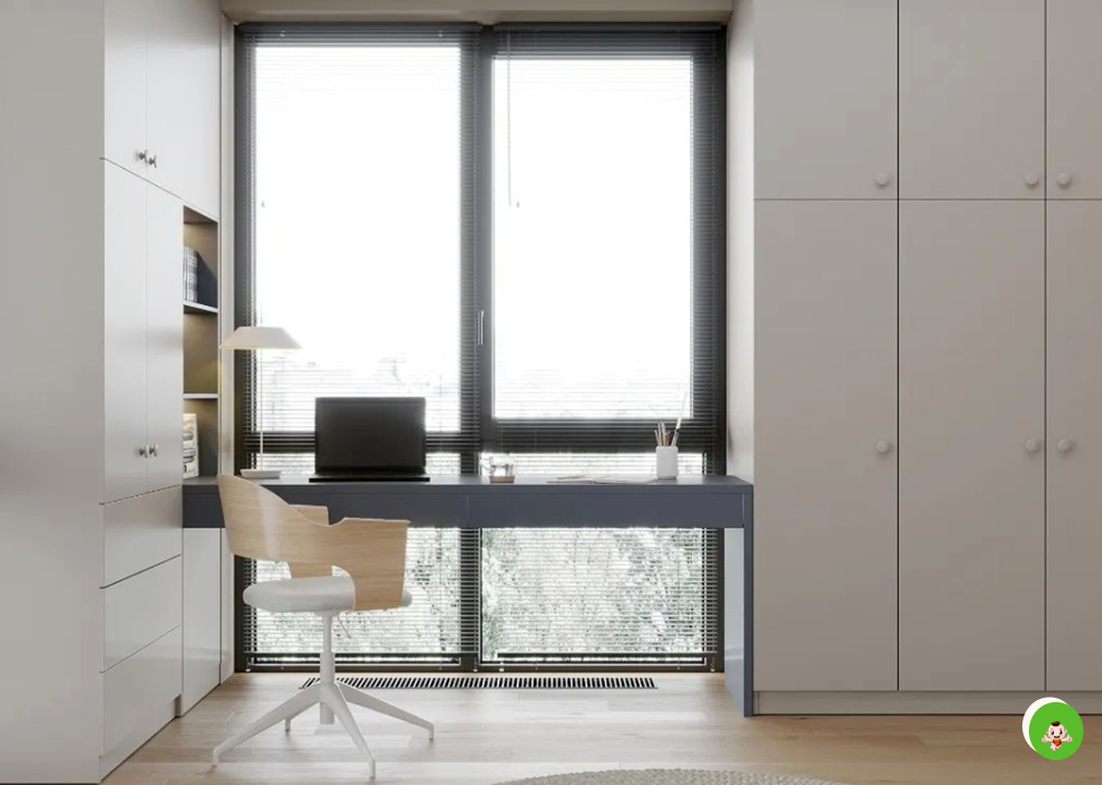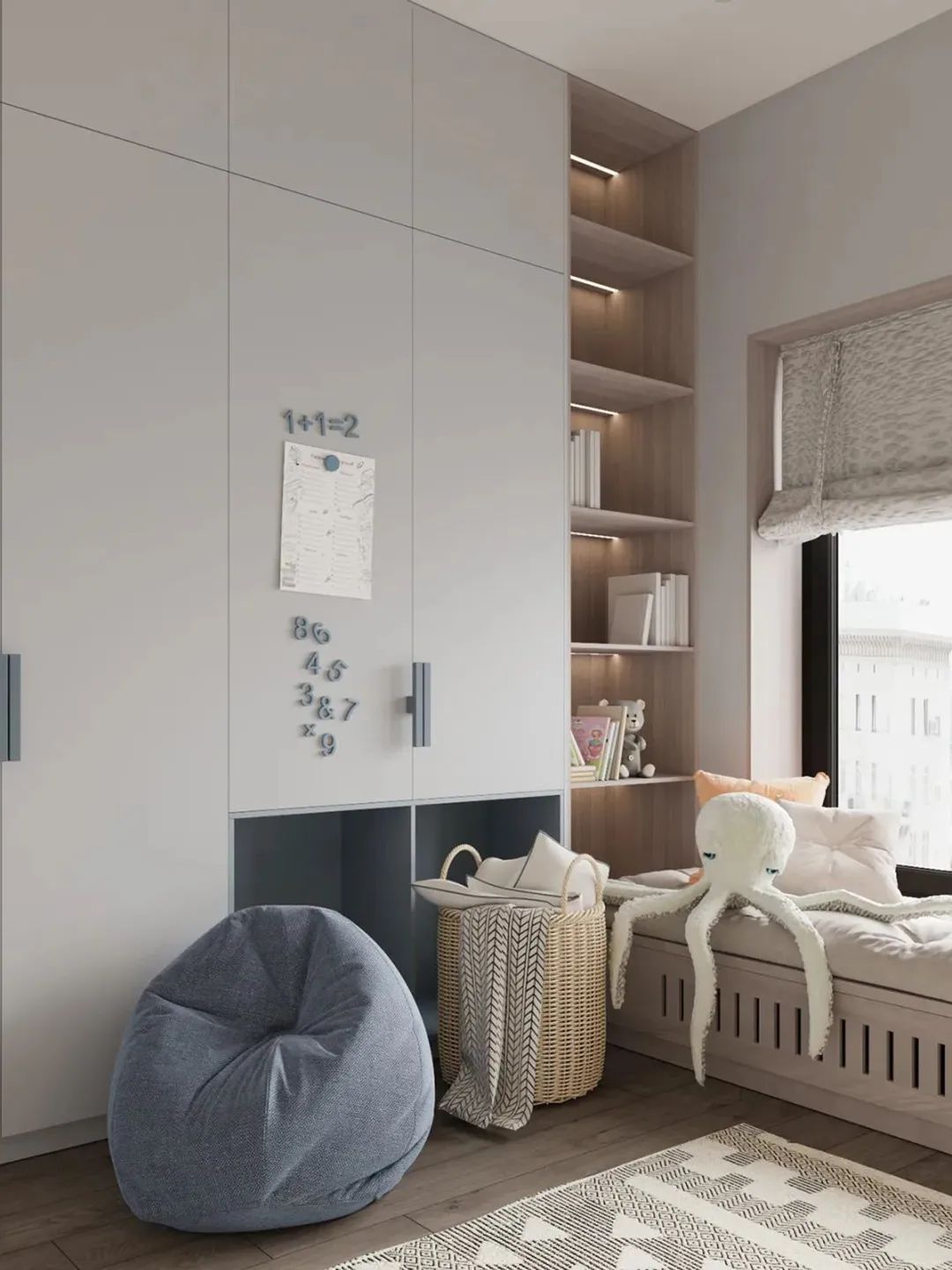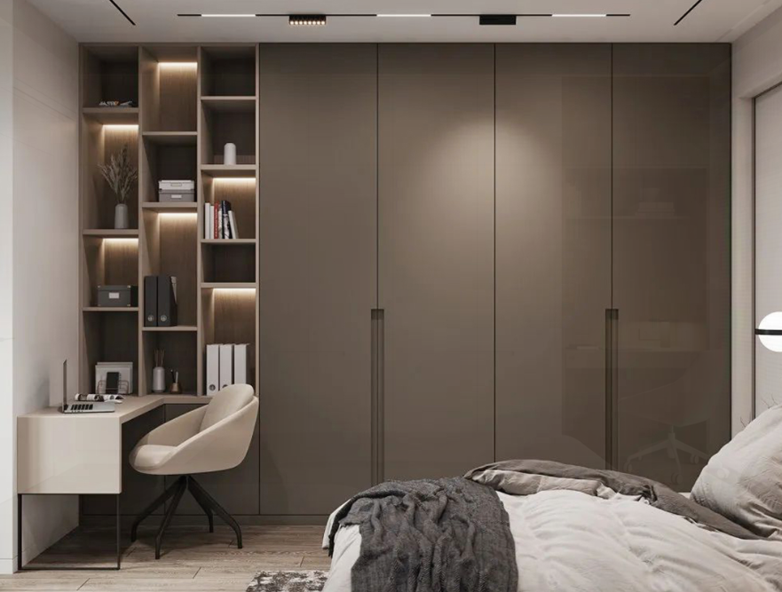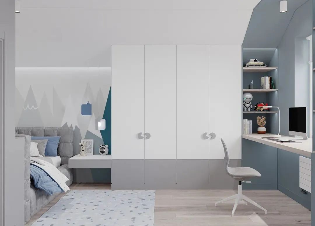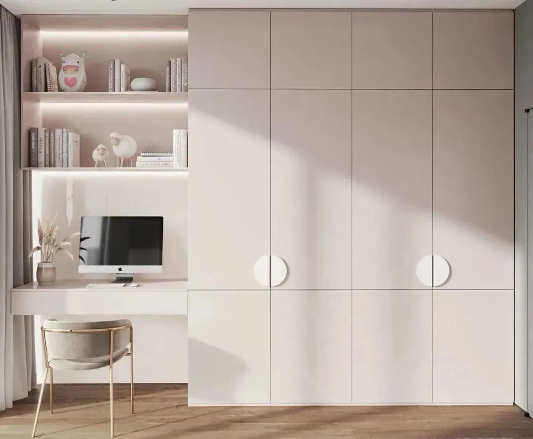 衣柜和書柜的組合設(shè)計是目前非常流行的一種組合方式,具備寧靜特征的衣柜搭配上需要安靜的書柜。不浪費空間,又層次漸進(jìn),保持了美感,又兼具了實用性,非常適合小戶型臥室使用。