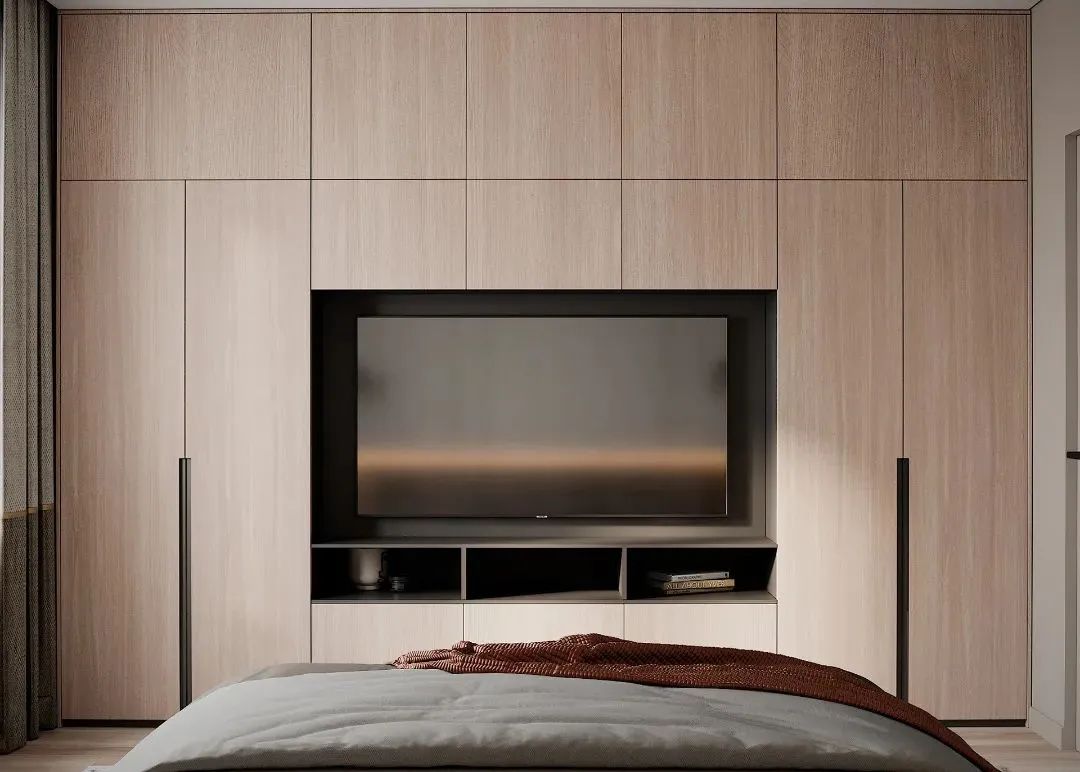 有的業(yè)主會選擇將電視搬進(jìn)臥室,將電視柜與定制衣柜進(jìn)行組合設(shè)計,既能滿足日常休閑需求,還能解決物品收納的問題,一舉兩得。