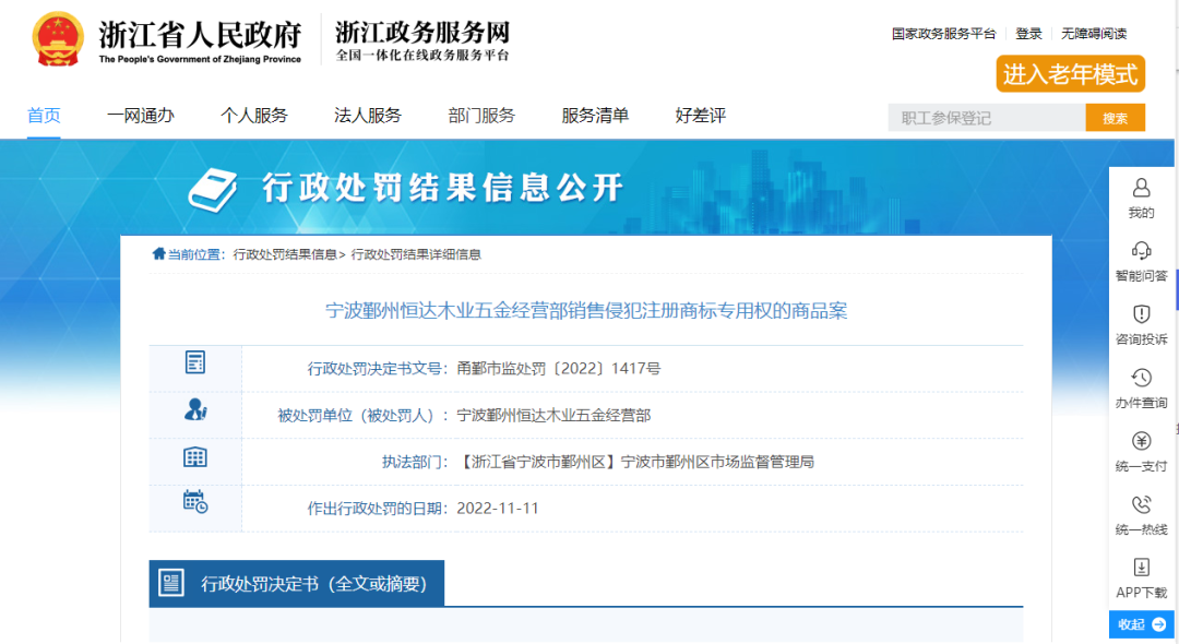 寧波市鄞州區(qū)市場監(jiān)督管理局從案件的初步核查、立案到調(diào)查取證等各個環(huán)節(jié),均發(fā)現(xiàn)侵權(quán)人存在違法違規(guī)行為;在該局的高度重視、秉公執(zhí)法、重拳出擊下,寧波鄞州恒達木業(yè)五金經(jīng)營部最終得到了相應的行政處罰決定。