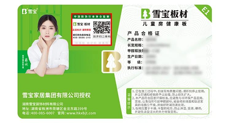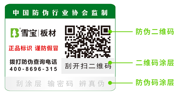 正品雪寶板材上,都貼有一張合格證。這張專屬的“身份證”,合格證上有專屬防偽碼。防偽碼可以查詢產(chǎn)品防偽的相關信息。