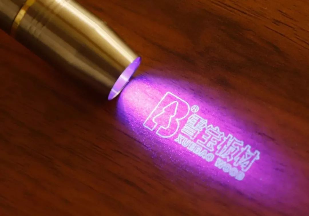 識別的方法也很簡單:普通的紫光燈照射到我們雪寶板材的板面,即可顯示“LOGO+雪寶板材”字樣。示例如下: