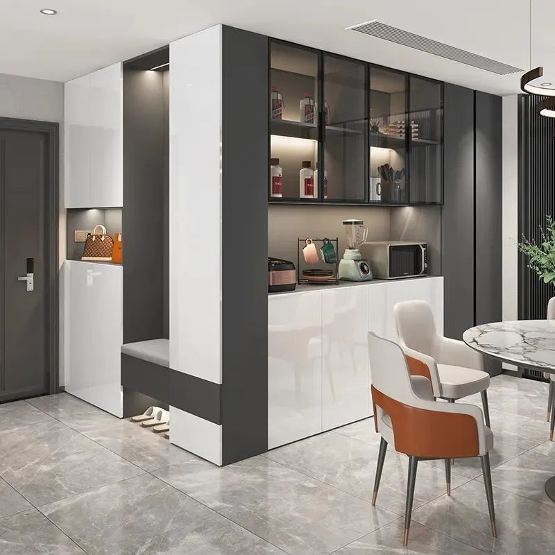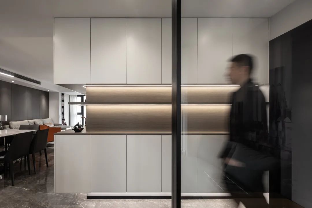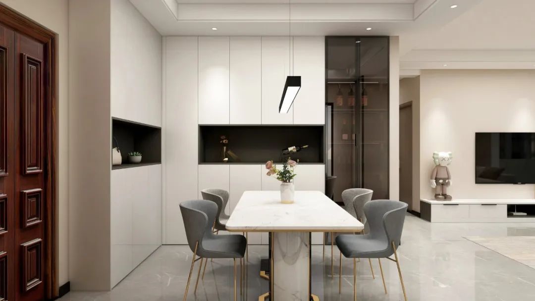 入戶和餐廳連在一起的戶型可以試試在入戶處打造“L型”入戶餐邊一體柜,以轉角區(qū)分二者功能,在不浪費每一平米墻面的同時,風格又和諧統(tǒng)一,避免了柜體配色困擾。