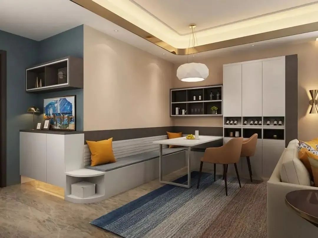 如果餐廳空間比較小的話,還可以在這里貼墻定制卡座來代替餐椅,不僅節(jié)約了椅子的占位,卡座還能用來儲物,進一步提高了空間利用率。