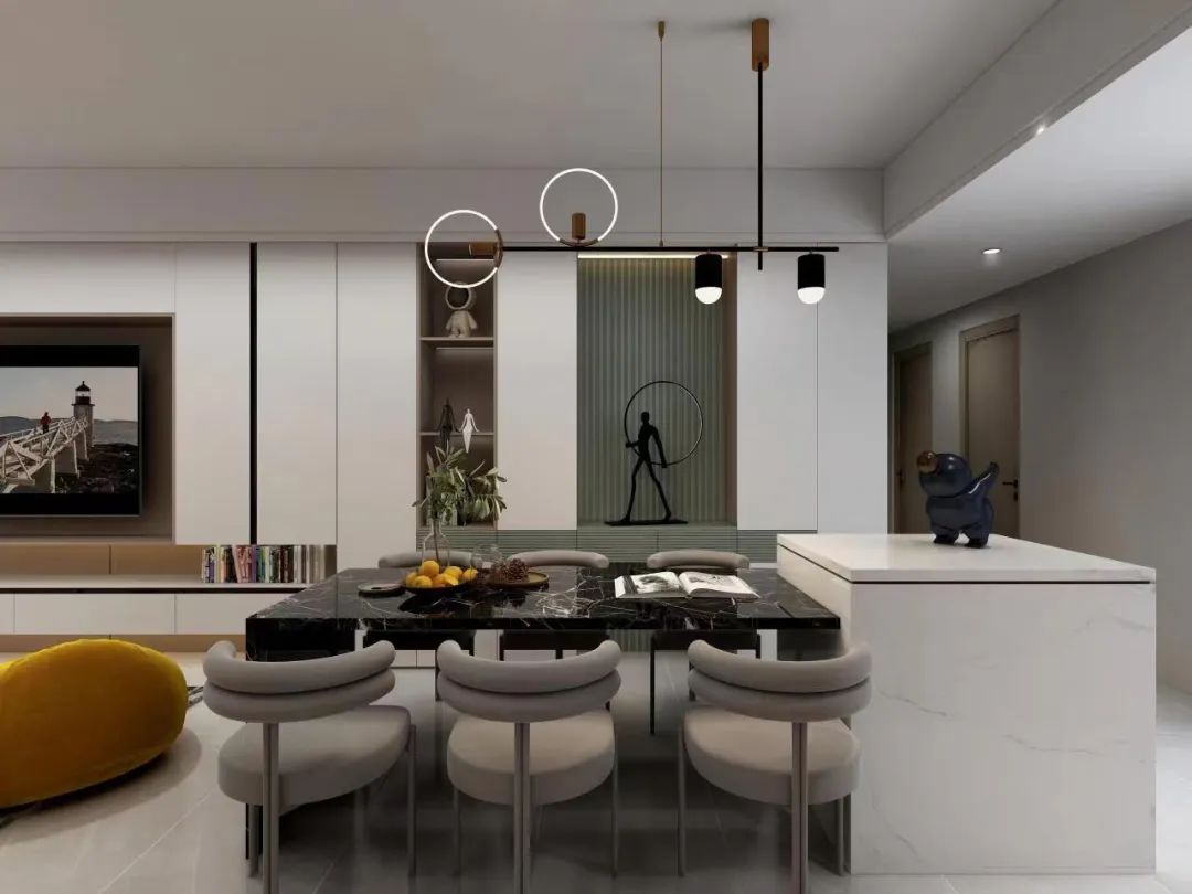 如果覺得客餐廳沒有隔斷,空間區(qū)域劃分不明顯的話,還可以在電視柜與餐邊柜中間設計整列開放格或其它方式作為視覺觀感上的區(qū)隔。