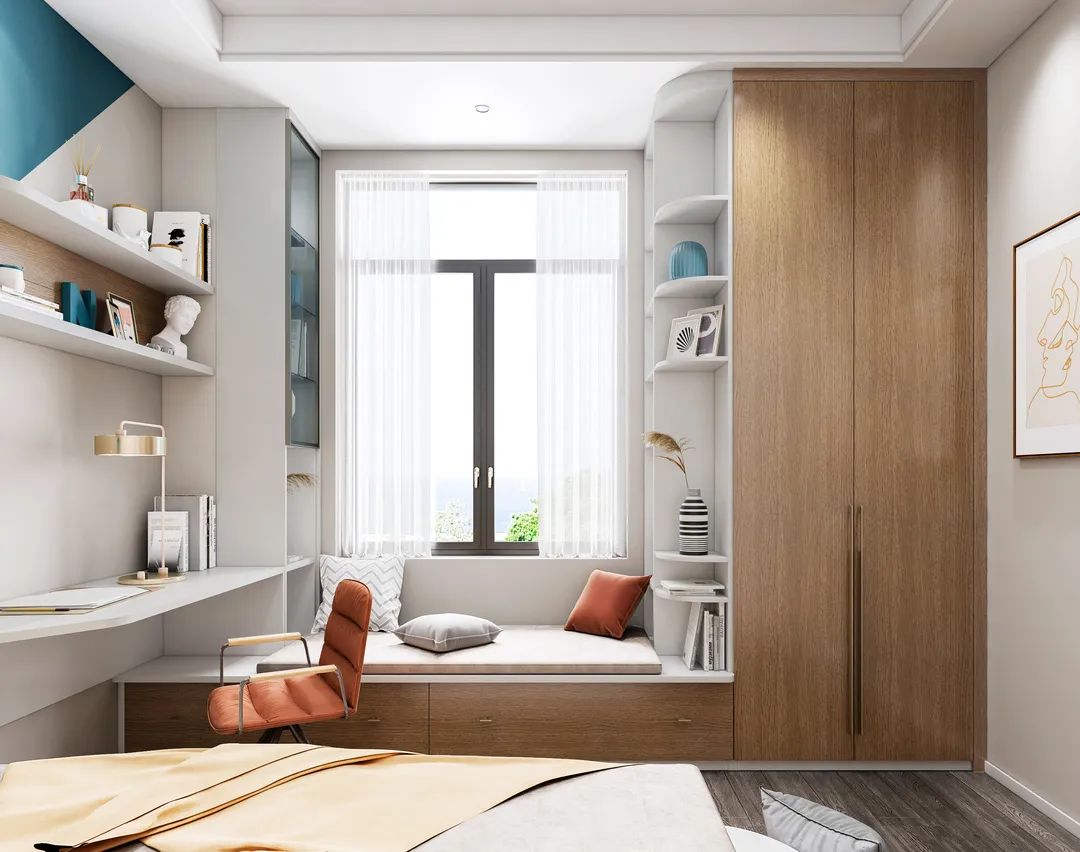 靠窗定制飄窗柜,擴大儲物空間,上鋪軟墊,可以坐躺在上面休息,放松身心;靠飄窗柜定制書柜和書桌,又成為了一個學習辦公區(qū),沒有獨立書房的家庭,就能把這里當開放式書房了哦~