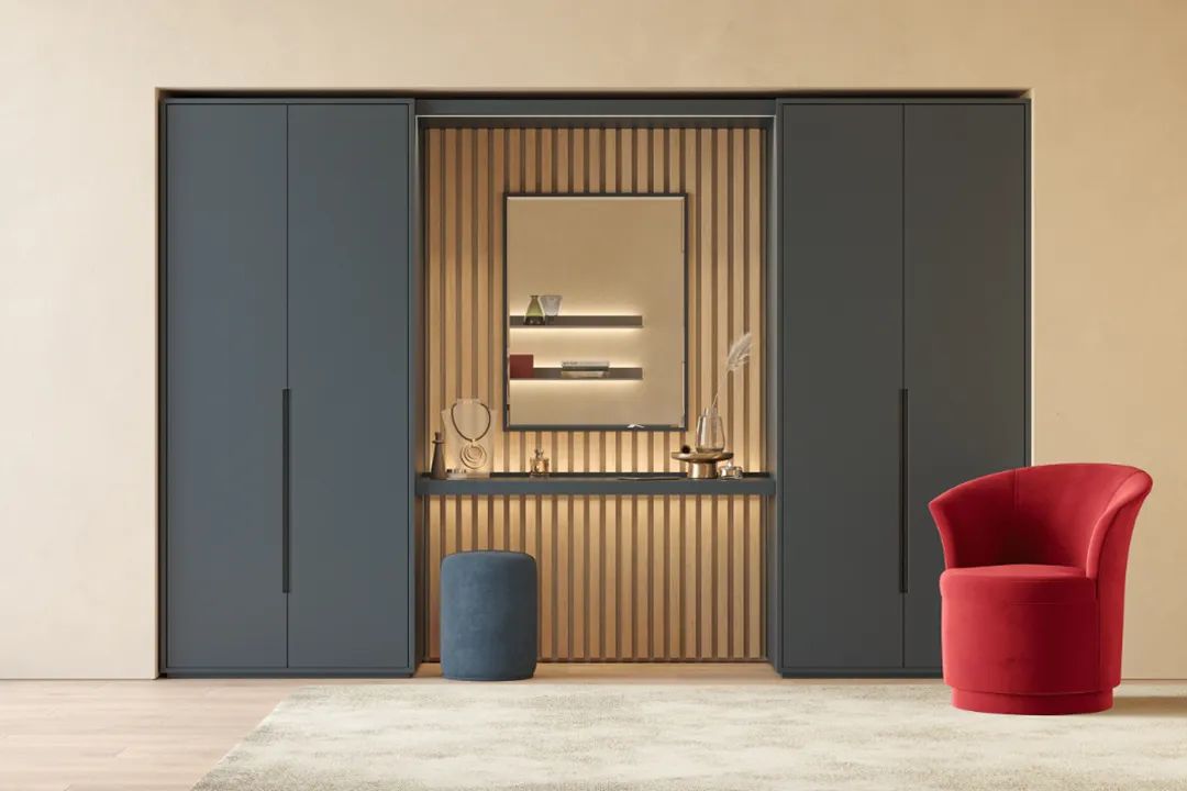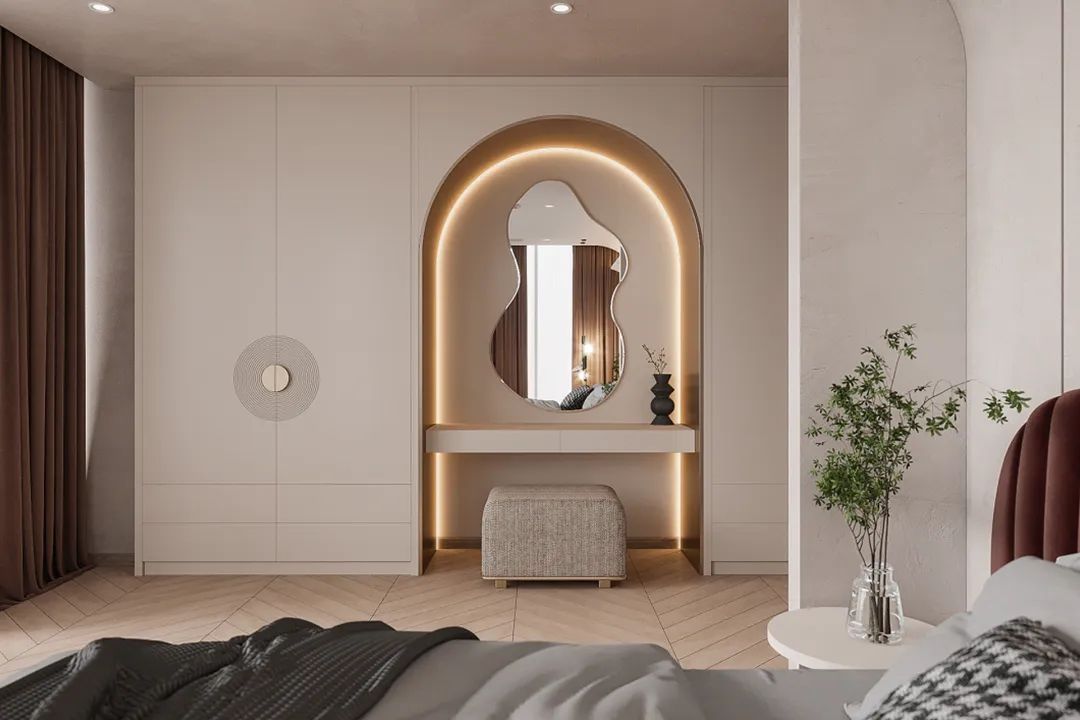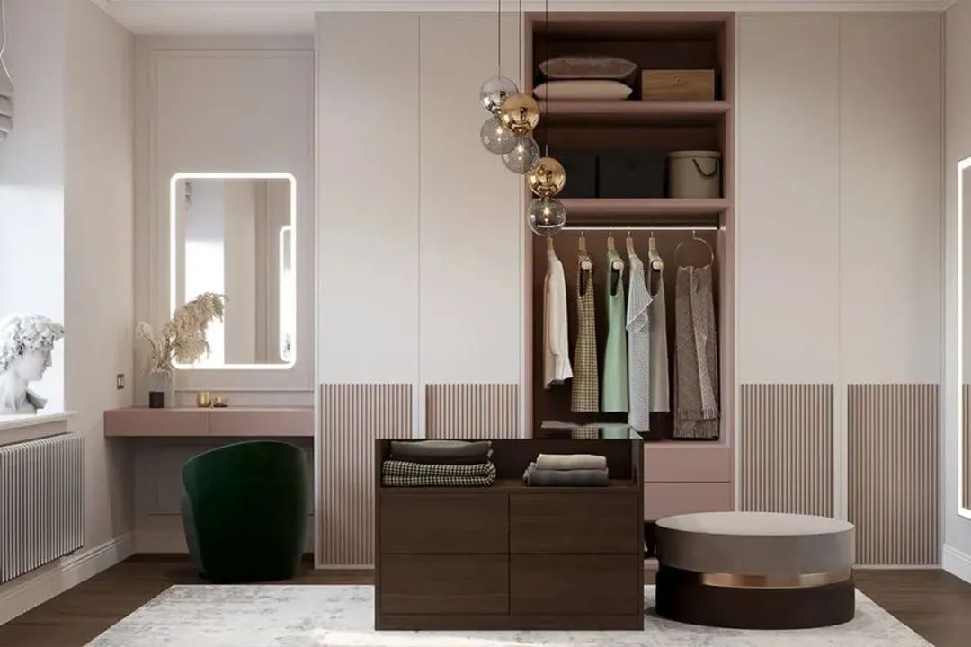 當然,除了延展出來,也可以直接把梳妝臺“裝”在衣柜里,做衣柜時提前設計好在某一處空出一個空間,定制一個置物格,安裝抽屜,充當梳妝臺面,不僅整體性強,也更節(jié)省空間。