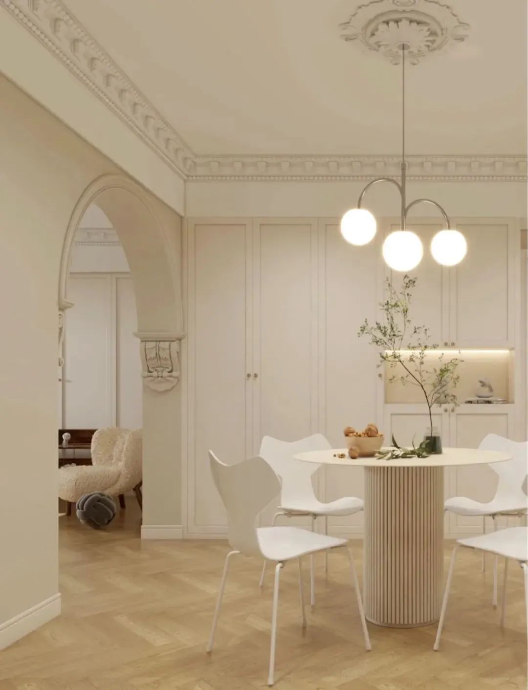 在奶油風的設(shè)計中,對于造型的把握主要在家具造型的選擇,以及空間硬裝造型的設(shè)計上。