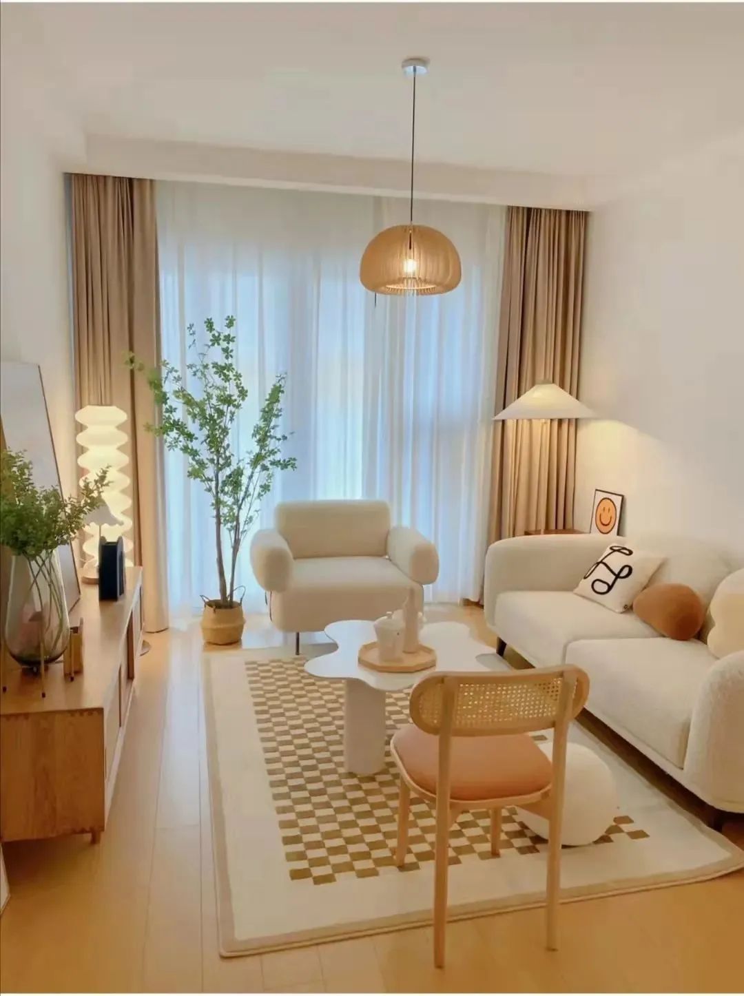 材質(zhì)方面為了符合奶油系風格的調(diào)性,材質(zhì)上要選擇比較有肌理感的,像羔羊絨、棉麻、原木等材質(zhì)都很合適。