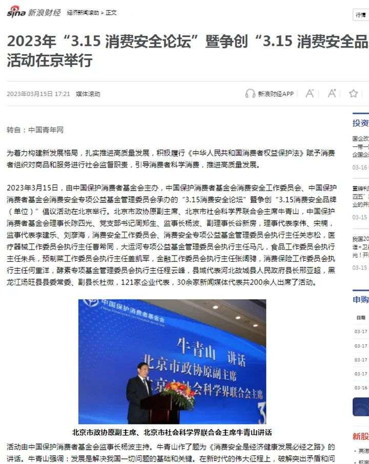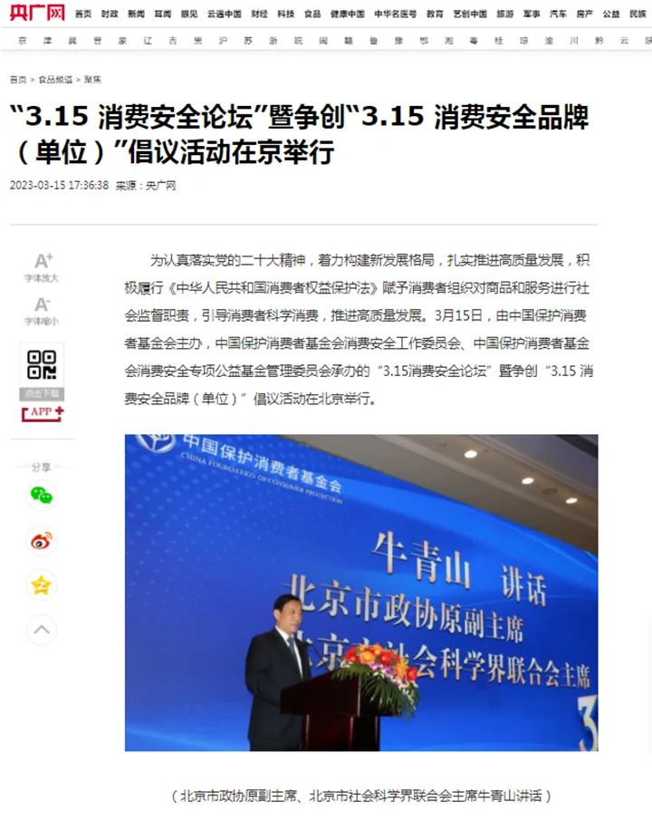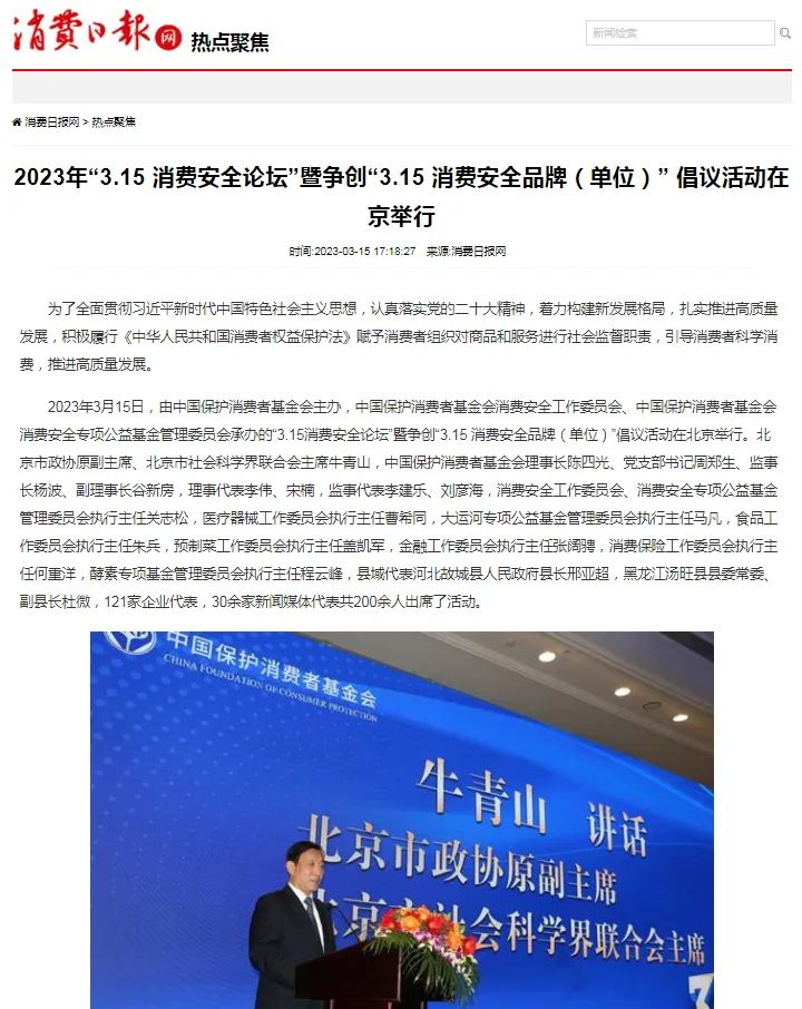 2023年3月15日,由中國保護消費者基金會主辦,中國保護消費者基金會消費安全工作委員會、中國保護消費者基金會消費安全專項公益基金管理委員會承辦的“3.15消費安全論壇”暨爭創(chuàng)“3.15 消費安全品牌(單位)”倡議活動在北京舉行。雪寶受邀出席,并被授予“爭創(chuàng)3•15消費安全品牌承諾單位”!