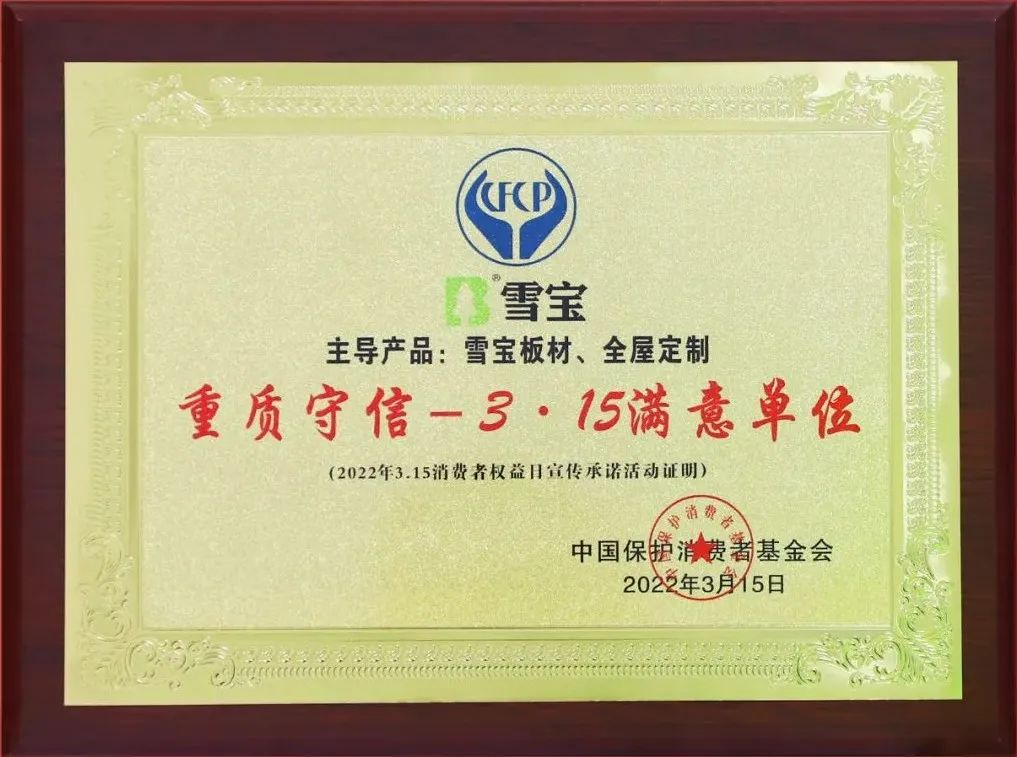 經(jīng)過多輪嚴格的評審與篩選,雪寶家居集團有限公司主導產(chǎn)品雪寶板材、全屋定制品類以優(yōu)異的產(chǎn)品品質(zhì)和良好的消費口碑,被中國保護消費者基金會授予“爭創(chuàng)3•15消費安全品牌承諾單位”!