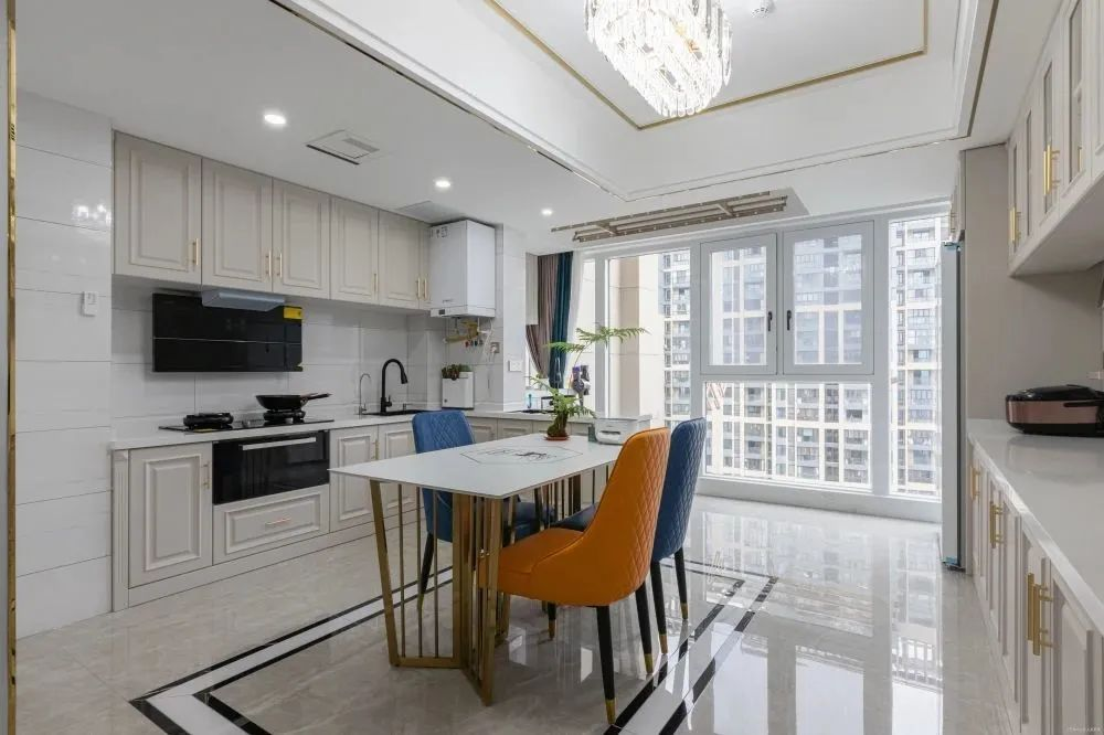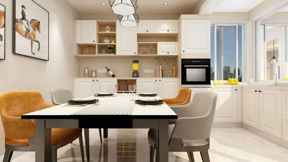 把餐廳和廚房作為一個(gè)統(tǒng)一的空間來做規(guī)劃,餐廳緊挨廚房,實(shí)現(xiàn)餐廚一體化設(shè)計(jì),提高空間利用率。