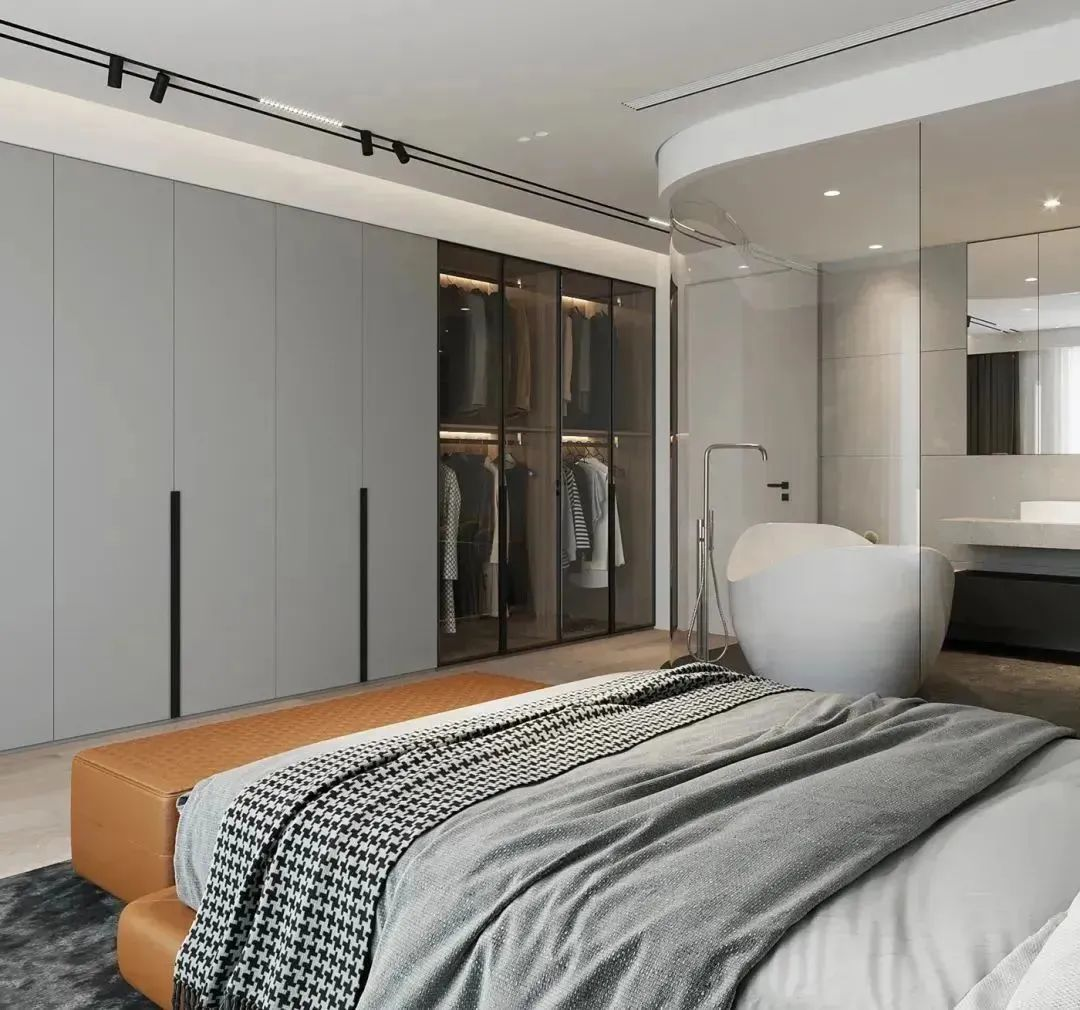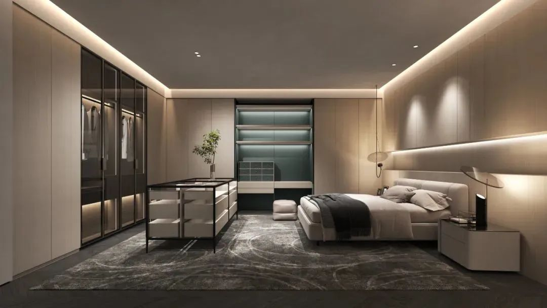 但是超高柜門一般都是一塊板從上貫到下,整體流暢、干凈利落,極簡(jiǎn)自然的氣質(zhì)就是它倍受歡迎的原因。輕奢風(fēng)格的空間設(shè)計(jì)中可以做無把手,或者豎長(zhǎng)把手,或者橫短把手一塊板從頂部順滑到下,給人的感覺非常的整體和美觀,簡(jiǎn)潔自然。