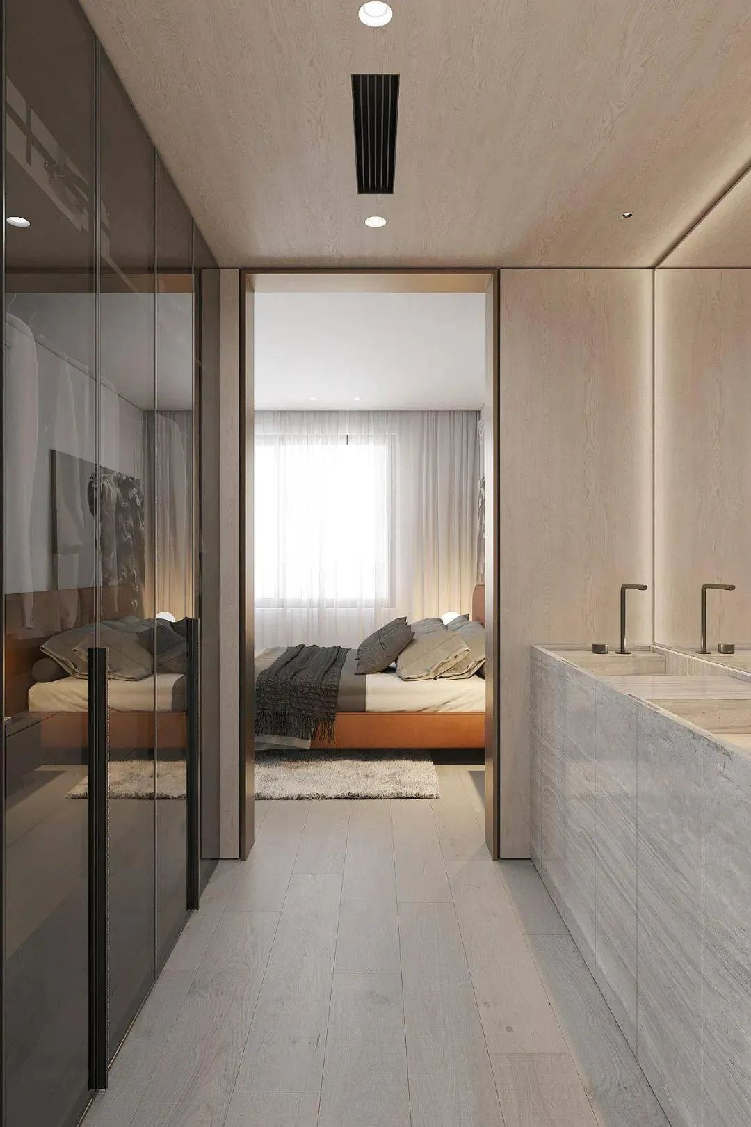 通過材質(zhì)和設(shè)計(jì)將門、墻、柜串聯(lián)為一體,融會(huì)貫通,突破獨(dú)立格局的限制,將門、墻、柜有機(jī)組合讓視線得以延伸,無形中"拓寬"家居空間,更能延展視野,從視覺角度達(dá)到空間延展的效果。