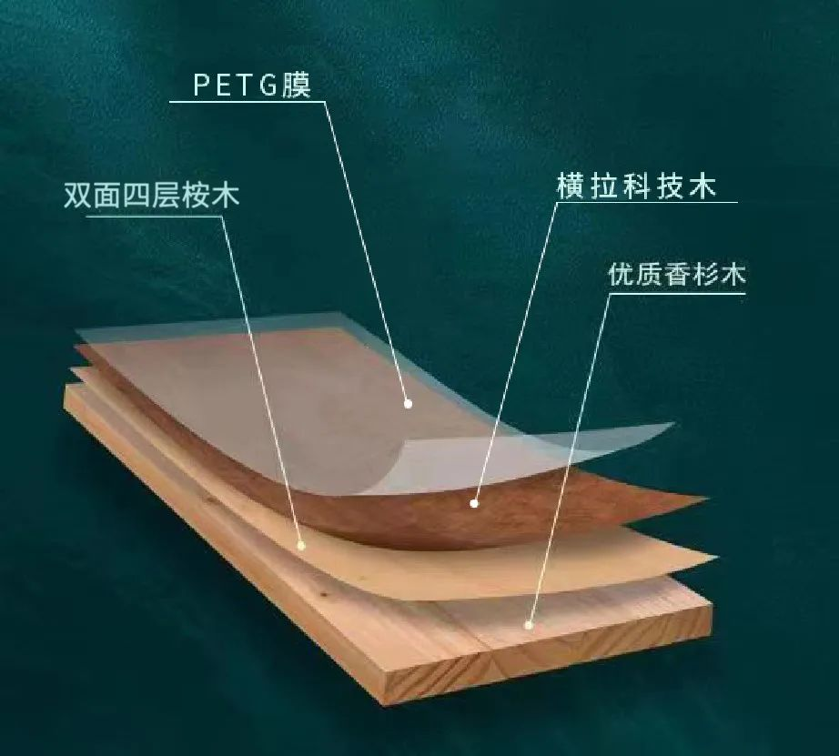 板芯精選規(guī)格統(tǒng)一的一級實木香杉方料齒接而成,首先貼第一層桉木養(yǎng)生一周并雙面精度砂光,再貼合第二層桉木再養(yǎng)生一周后,再一次進行雙面等厚精度砂光處理,保證正誤差范圍20絲以內(nèi),然后做雙面橫拉科技木皮,確保板材平衡穩(wěn)定無變形,后貼楊木大皮保證板材表面平整光滑,最后貼雙面同色三聚氰胺紙后做PETG貼合。