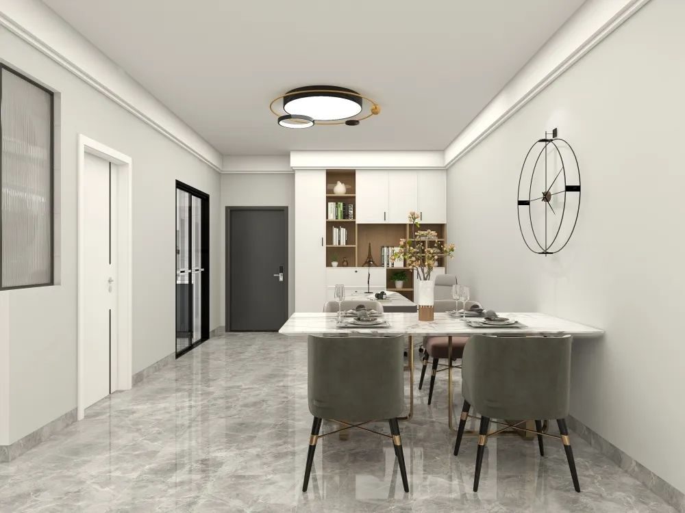 如果客廳和餐廳中間是走廊過(guò)道,可以利用地面瓷磚的鋪貼方式來(lái)劃分出客廳和餐廳,對(duì)地面瓷磚做邊線(xiàn)造型設(shè)計(jì),既能劃分出空間,同時(shí)又起到了很好的裝飾效果。