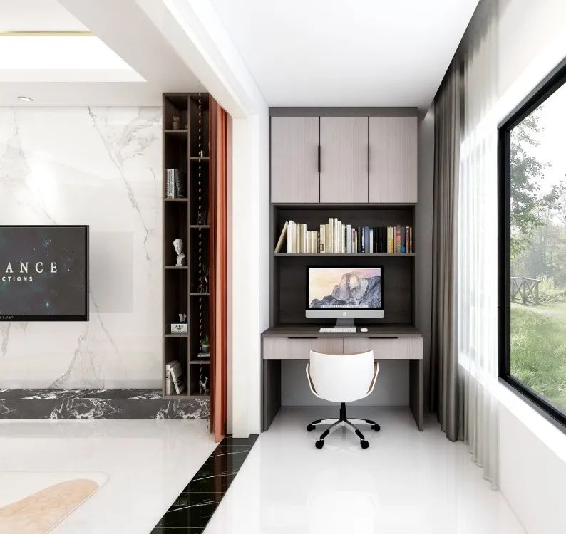書柜的組成部分是由書桌+書架組成的,一般小戶型的空間有限,書房幾乎沒有,為了能夠滿足于書房的設(shè)計(jì),我們把陽臺(tái)的空間利用起來定制成一個(gè)書柜。
