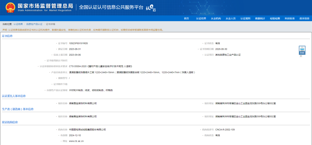 兒童安全級產(chǎn)品認(rèn)證,以更嚴(yán)苛的環(huán)保標(biāo)準(zhǔn)、更嚴(yán)謹(jǐn)?shù)恼J(rèn)證規(guī)則,旨為保障兒童活動場所質(zhì)量及環(huán)境安全健康,也為踐行國家質(zhì)量強(qiáng)國戰(zhàn)略、保證兒童健康生活貢獻(xiàn)力量。本次獲得由中國國檢測試控股集團(tuán)股份有限公司(CTC)出具的兒童安全級產(chǎn)品認(rèn)證證書顯示:產(chǎn)品符合 CTS 05004-2020《建材產(chǎn)品兒童安全級評價(jià)技術(shù)規(guī)范人造板》的要求,進(jìn)一步有力證明了雪寶板材飾面人造板材系列產(chǎn)品的健康和環(huán)保性,同時(shí),雪寶板材產(chǎn)品環(huán)保性、安全性得到國家官方權(quán)威機(jī)構(gòu)的認(rèn)證,也是對我們致力拔高行業(yè)的產(chǎn)品環(huán)保水平新高度的認(rèn)可和肯定!