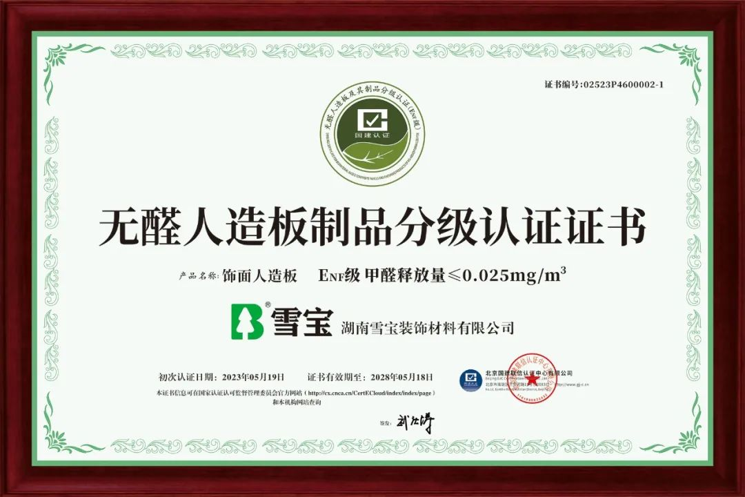 雪寶獲得“無醛人造板制品分級認證證書”