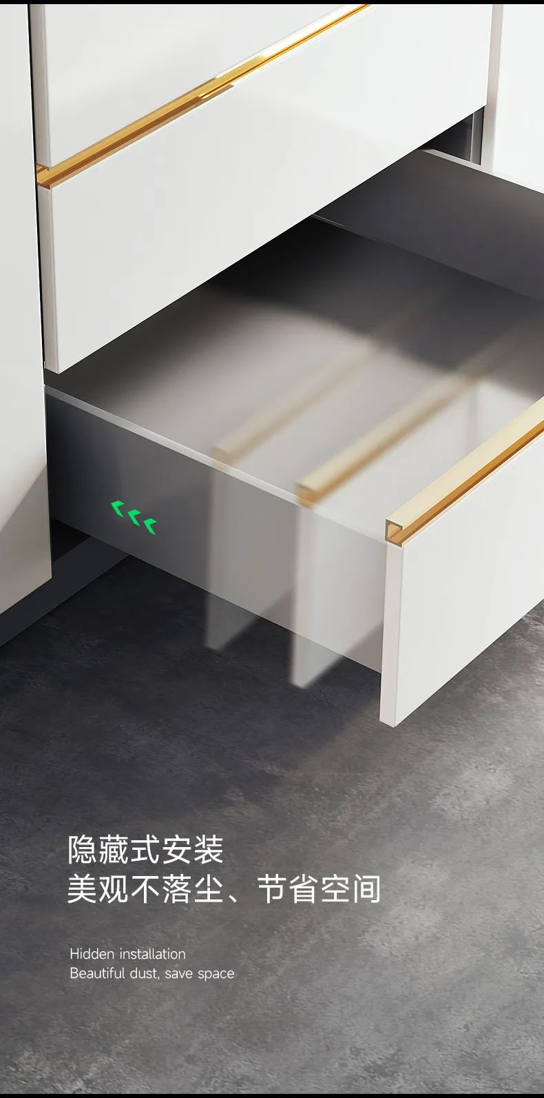 雪寶隱藏式托底軌全拉伸隱藏滑軌,無需工具,抽屜可快速安裝和拆卸。全拉設(shè)計可使抽屜全部拉出,充分使用抽屜空間,提高空間利用率;夒[形設(shè)計,隱藏在抽屜底部,從正面、側(cè)面都看不到,視覺上更美觀,并且滑軌內(nèi)置集成阻尼系統(tǒng)。