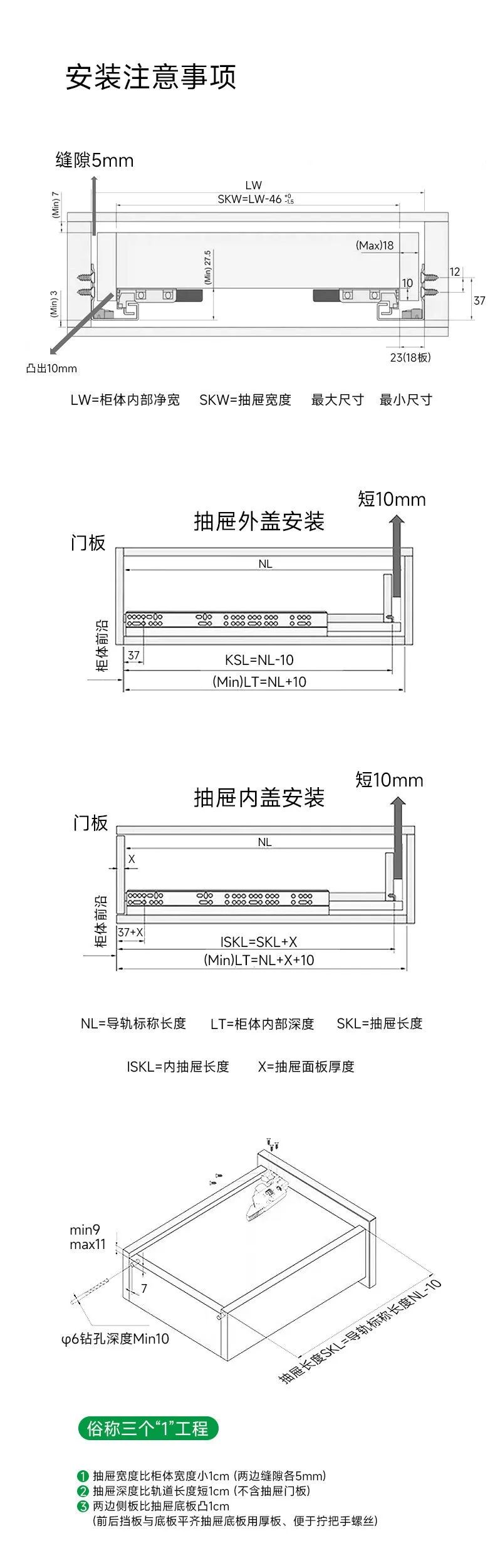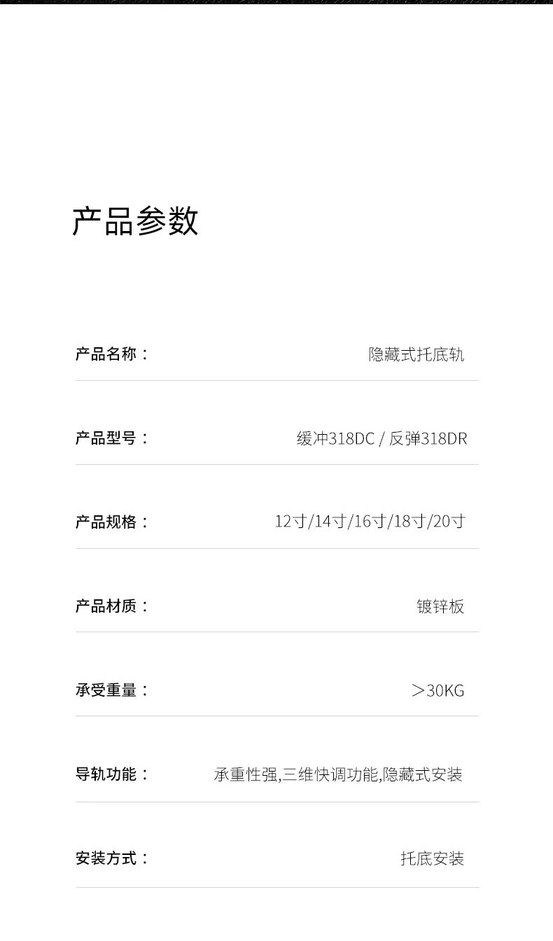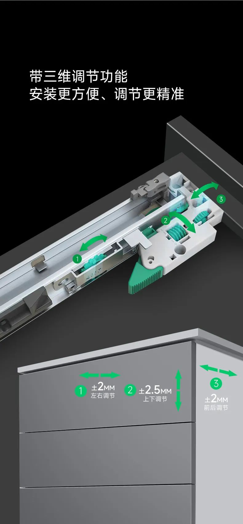 1、觸感柔和,質(zhì)感高級;2、隱藏式安裝,美觀不落塵、節(jié)省空間;3、30KG承載,順暢性好、承重性強;4、一鍵拆卸卡扣,方便抽屜衛(wèi)生清掃;5、三維快調(diào),安裝更方便、調(diào)節(jié)更精準;6、靜音緩沖關(guān)閉、免拉手按彈開啟;