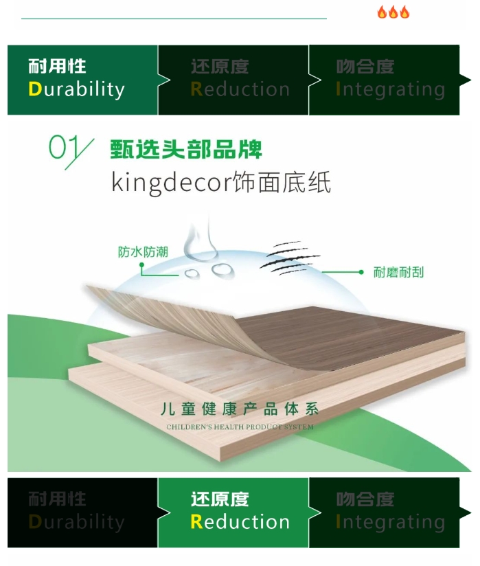 從工藝角度上“德瑞夫”代表著這項工藝的6大特點集合,即耐用性強、還原度高、吻合度好、平整度高、逼真度高、穩(wěn)定性好。一個融合6大工藝和原料的全新獨有行業(yè)首創(chuàng)工藝技術,實現(xiàn)雪寶飾面效果100%還原實木紋理的同時,強調(diào)了雪寶板材優(yōu)異品質(zhì)的獨特性。從文化內(nèi)涵方面而言,“德瑞夫”與雪寶板材的品牌理念如出一轍,將“德瑞夫"與“兒童健康”相結合,切實為兒童健康成長提供保障。