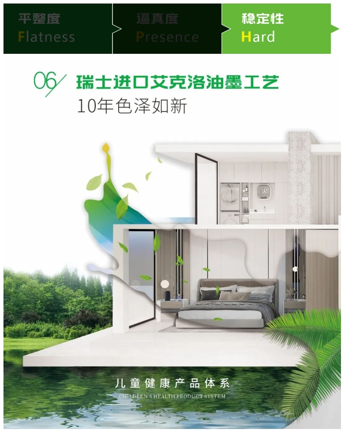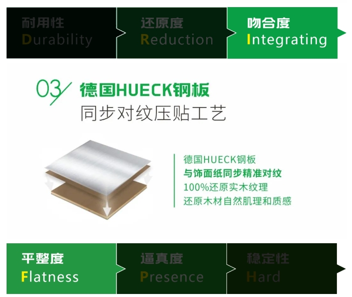 從飾面紙張的耐用性(Durabilityt)、3D印刷技術實木紋理的還原度(Reduction)、鋼板與飾面紙同步精準對紋壓貼的吻合度(Integrating)、2次雙面定厚砂光板面的平整度(Flatness)、4+1色印刷技術的飾面效果逼真度(Presence)、進口艾克洛油墨工藝締造10年色澤如新的穩(wěn)定性(Hard)6個維度創(chuàng)造,100%還原實木紋理。