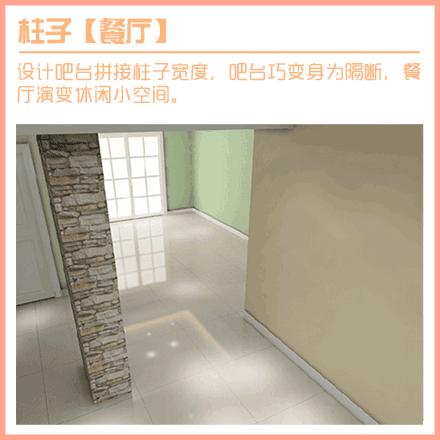 【4、柱子·餐廳】設(shè)計吧臺拼接柱子寬度,吧臺巧變身為隔斷,餐廳演變休閑小空間。