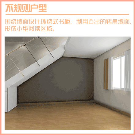 【9、不規(guī)則戶型】圍繞墻面設(shè)計環(huán)繞式書柜,利用凸出的轉(zhuǎn)角墻面,形成小型閱讀區(qū)域。