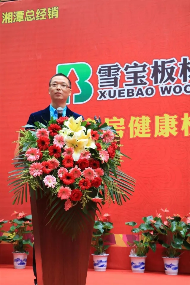 ▲雪寶板材國內(nèi)營銷中心總經(jīng)理李振先生為開業(yè)典禮致辭