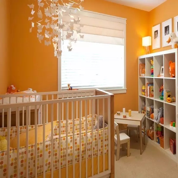 一個個格子組成的玩具柜,提高空間的收納功能,拿取方便。而玻璃窗有提亮空間的作用,整體橙色基調(diào)搭配懸吊的裝飾,給這溫馨的空間增添些許靈動美和趣味性。