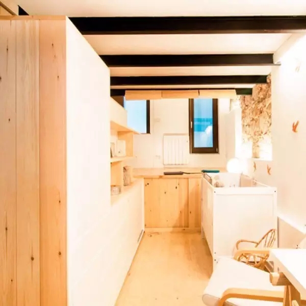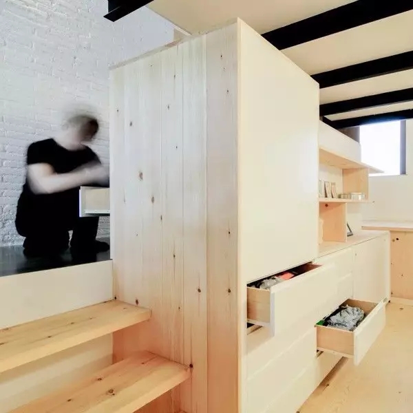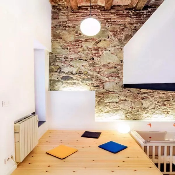 背景墻保留了裝修前的模樣,古舊簡陋的墻壁為角落空間增添了工業(yè)風(fēng)和復(fù)古風(fēng)。儲物柜作為嬰兒房的收納空間,其頂部與地面層持平,成為了走廊空間。因為吊頂足夠高,所以走在上面也不會碰頭。